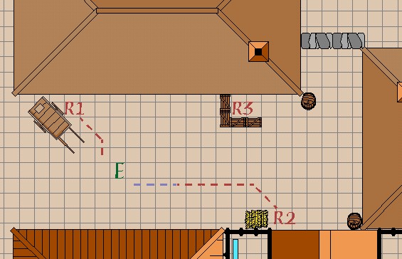 R2's Action: This fellow chooses to take a double move, covering 40' of ground. He's still about 15' away