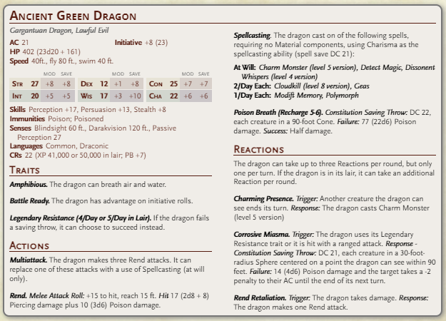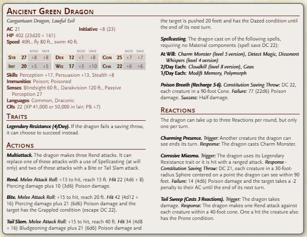 Why did you take away several of its traits?OK, I did a little experiment with the Ancient Green, see below. First is the preview anceint green and second is a mildly revised ancient green with a bite and tail attack added. It takes up almost the same space, but provide more interersting options IMO. What do you think.