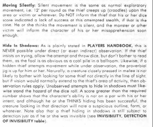 Oh yeah, Thieves getting xp for loot is a pretty good deal. As for Stealthing, I think the problem was that the text, at least in 2e, was specific to mention that you "THINK" you are silent/hidden on a failed roll. The implication is that you have to be one or the other.