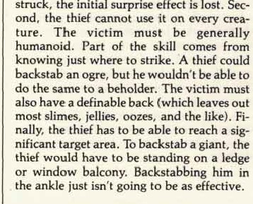 To use this ability, the thief must be behind his victim and the victim must be unaware that the thief intends to attack him. If an enemy sees the thief, hears him approach from a blind side, or is warned by another, he is not caught unaware, and the backstab is handled like a normal attack (although bonuses for a rear attack still apply). Opponents in battle will often notice a thief trying to maneuver behind them—the first rule of fighting is to never turn your back on an enemy! However, someone who isn’t expecting to be attacked (a friend or ally, perhaps) can be caught unaware even if he knows the thief is behind him.