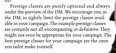 One thing that I find to be very noticeable with 3rd edition in hindsight is that there seems to be a very considerable disconnect between the people who designed the main rules set of the game, and the people who actually wrote the majority of supplements over the game's seven year run. Manifested very strikingly here at the introduction to Prestige Classes in the