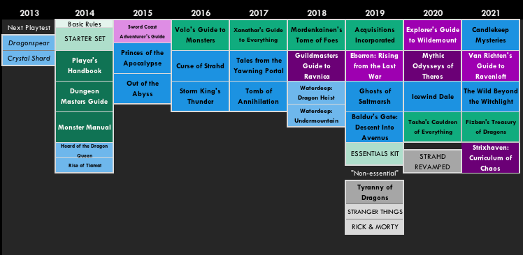 So if we take those two years, we have at least 10 books, maybe as many as 12-13 if they decide to expand the quantity (meaning, 10 if the pattern of 5 per year holds, but up to 13 if they move to 6 in 2022 and 7 in 2023, which I think is unlikely but possible). If we also take the basic formula of 1 splat, 1-2 adventure books, and 1-2 settings per year, that gives us: