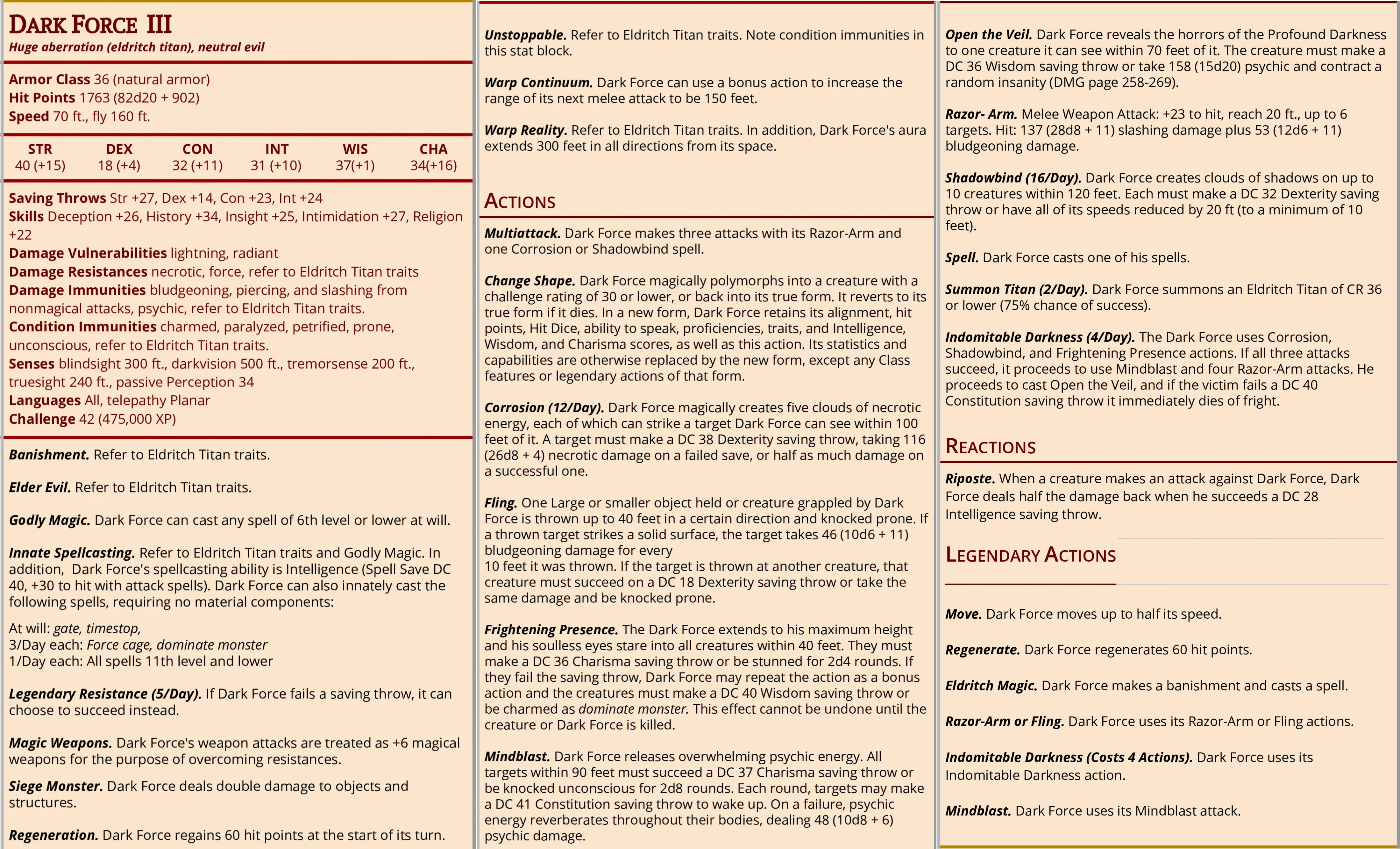 Here are most of the deities / primordials / powers /mythic beings I plan to stat in the future. Dark Dragon and Dark Force are from Phantasy star IV, so is the profound darkness which i forgot to add (CR 58, Colossal, 21,000 HP). Behemoths are from final fantasy, I renamed them in most cases for the sake of variety. Some monsters (Lamashtu, Rovagug, and many others) are from Pathfinder. This list is incomplete.
