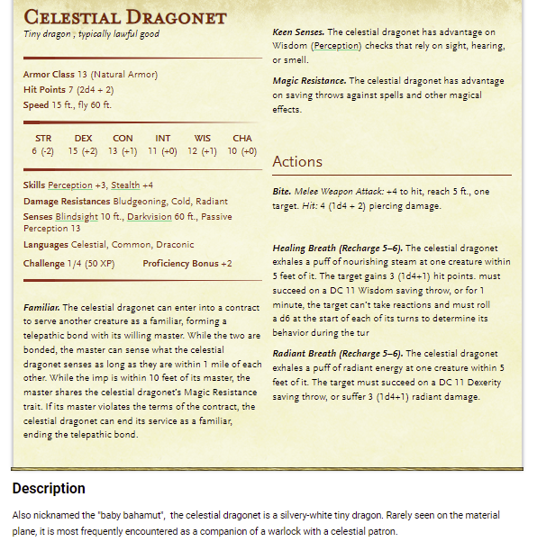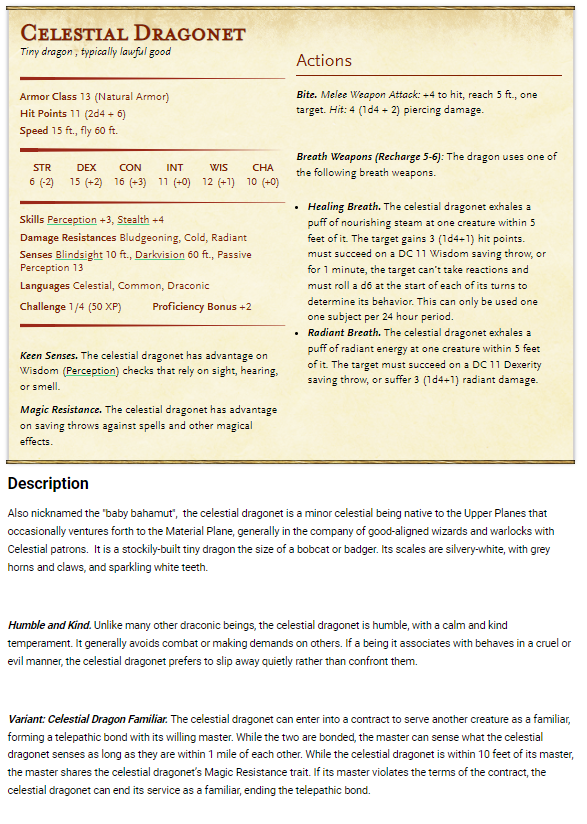- Radiant Breath. The devadragonet exhales a glorious beam of light at at one creature within 10 feet of it. The target must make a DC 11 Dexterity saving throw or take 10 (3d6) radiant damage and be blinded for 1 minute; if they save successfully they take half damage and are not blinded. A creature can repeat the saving throw at the end of each of its turns, ending the blindness effect on itself on a success. Radiant breath does no damage to celestial creatures but can still blind them.