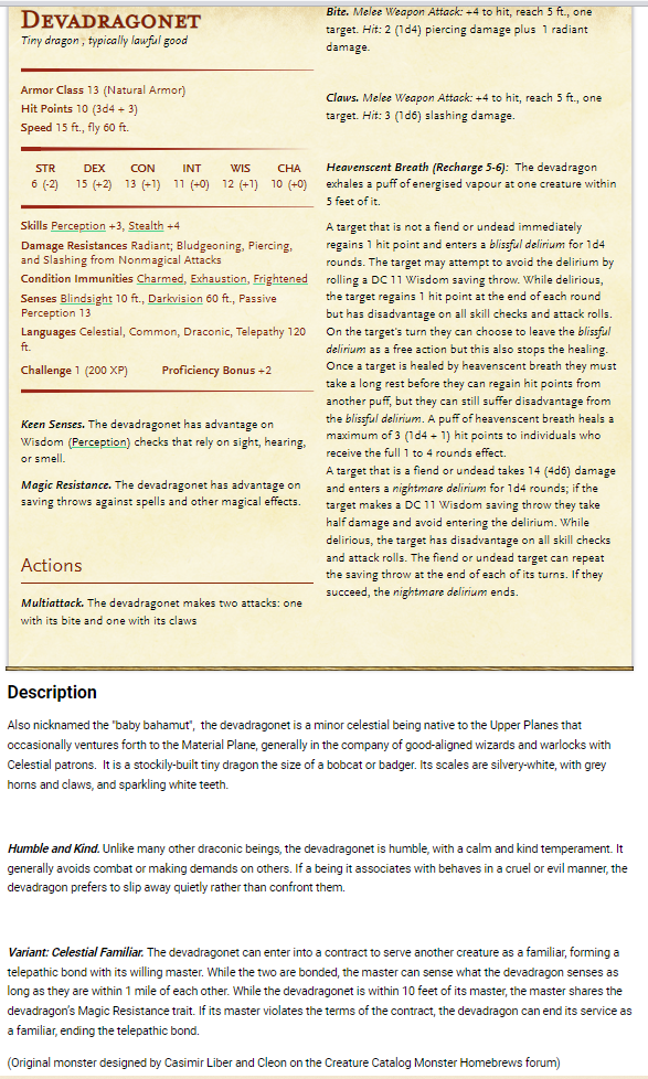 I'd consider tweaking the Heavenscent damage to Fiends and Undead up to 3d8 or 4d6 damage vs Fiends or Undead so the Devadragon's Heavenbreath does similar damage to an Imp as the Imp's Sting does to a Devadragon. The latter's pretty much "save and die" as it's average damage on a save is higher than the platinum wyrmling's Hit Points.