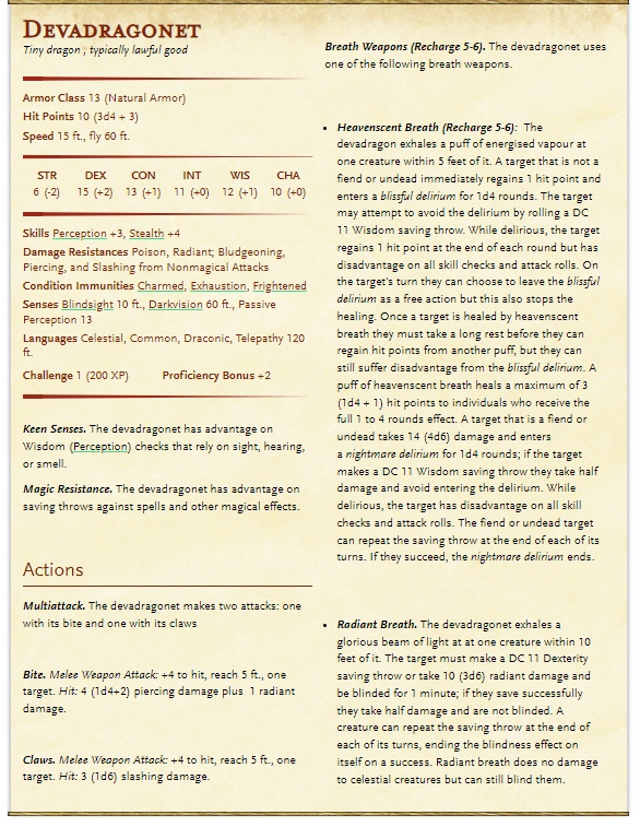Also nicknamed the "baby bahamut", the devadragonet is a minor celestial being native to the Upper Planes that occasionally ventures forth to the Material Plane, generally in the company of good-aligned wizards and warlocks with Celestial patrons. It is a stockily-built tiny dragon the size of a bobcat or badger. Its scales are silvery-white, with grey horns and claws, and sparkling white teeth.