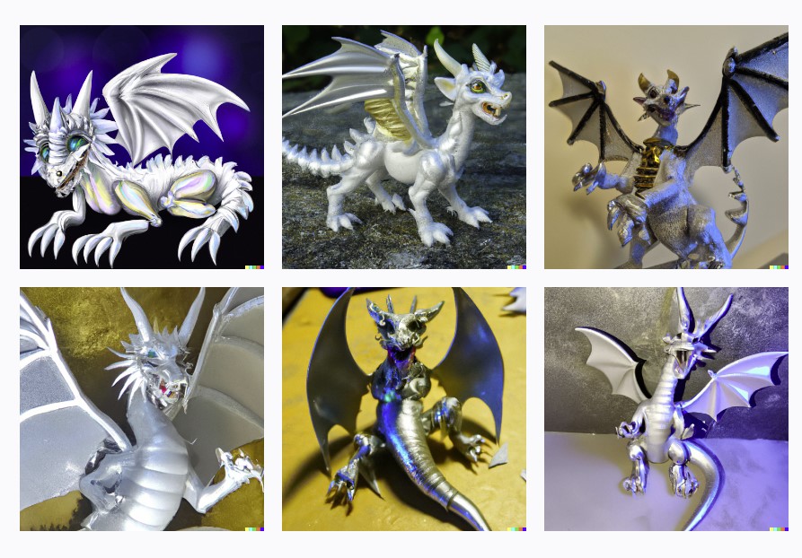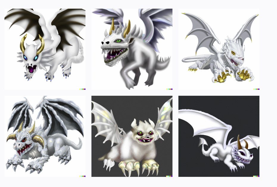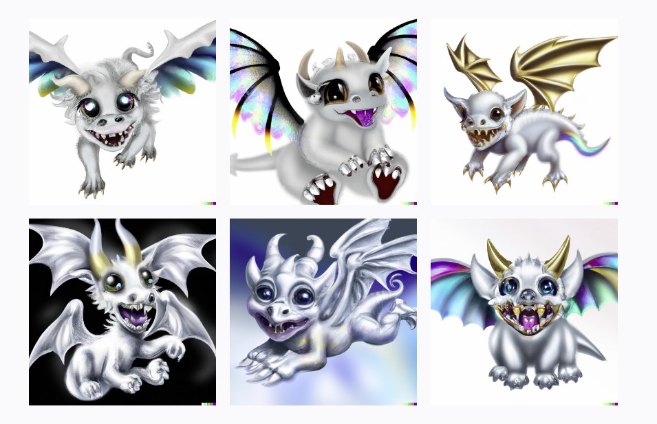 Playing with the AI thingy Dall-e.. typing "baby silvery-white angel dragon with rainbow wings and golden eyes, horns and claws, and white teeth" gave me these...some are outright creepy...
