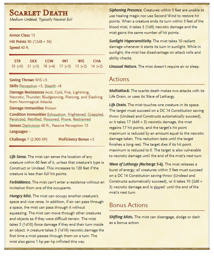 Skills: *A crimson death’s misty form makes it difficult to spot in fog. Before feeding, the creature receives a +8 bonus on Hide checks in smoky or foggy areas. After it has fed, the bonus drops to +4 because of its red coloration.