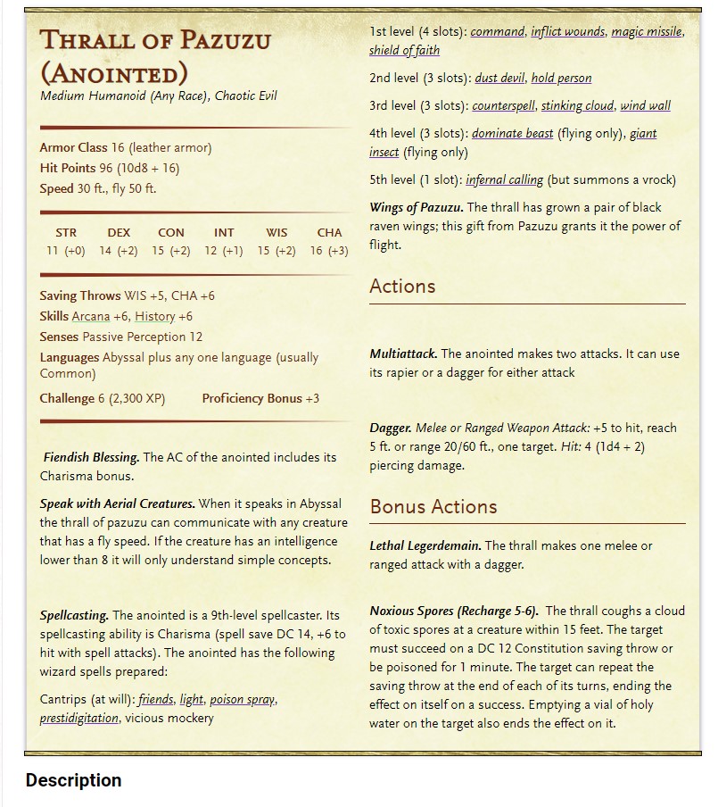 I did wonder about doing a more powerful 5E Thrall of Pazuzu based on the higher levels of the original prestige class, which had an increased flight speed, they could dominate aerial creatures as well as charm them, and their breathe weapon was both more powerful (multiple swarms of locusts), versatile (could breathe cones of acid instead of locusts) and frequent (usable multiple times per day).
