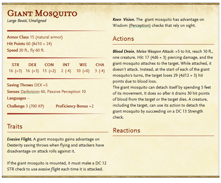 Females stab victims with their proboscises. If a female giant mosquito inflicts six or more points of damage in a single hit, she has grabbed her victim with her stylets and will begin draining the victim’s blood the next round. Each round of blood drain robs the victim of one point of Strength and gives the female mosquito one hit point. When the mosquito has drained as many points of Strength as she has hit dice (seven points for a culex, eight for an anopheles), she detaches herself and flies away to lay eggs.