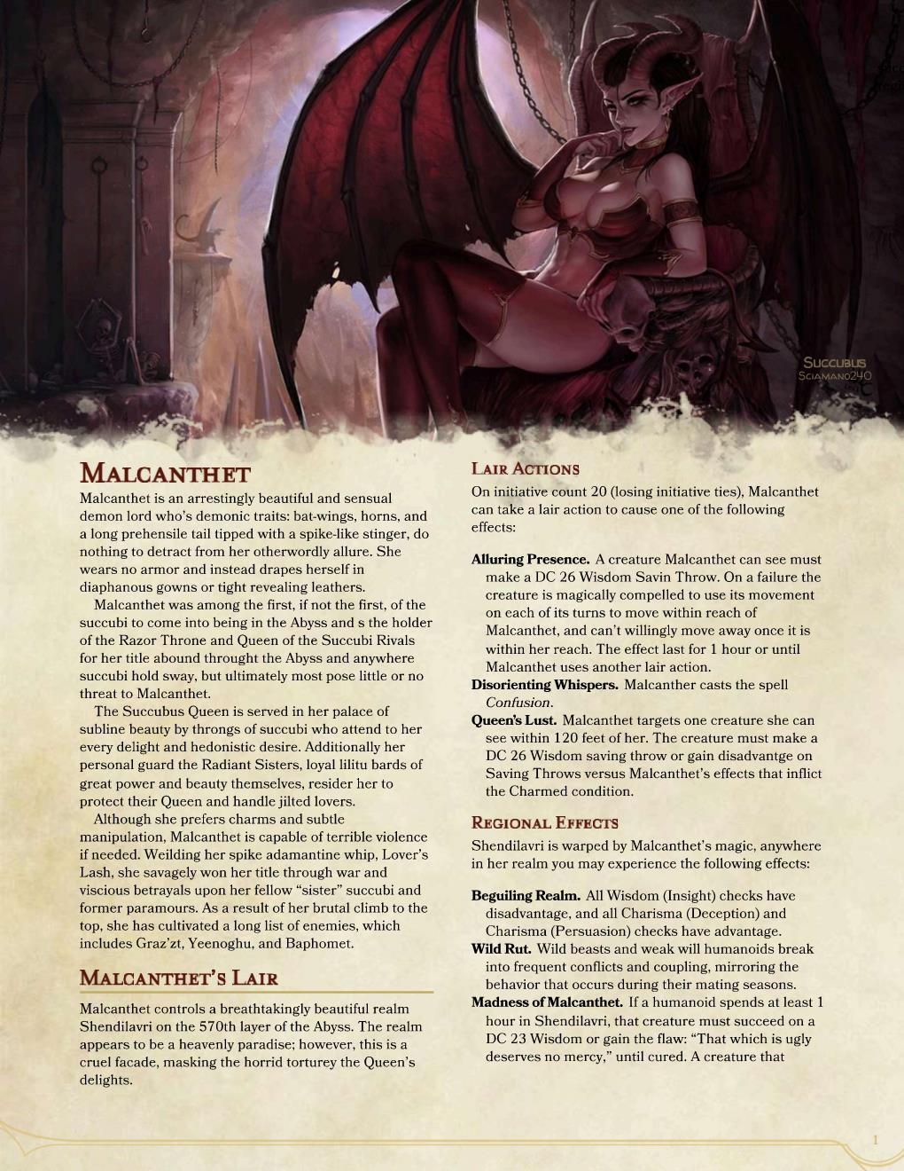 OK, I wasn't happy looking at my old Epic Updates version of Malcanthet. So, in response to another thread I quickly drafted up a new one. It is still rough, needs an edit pass or two, some statblock refinement, and should be expanded another 2-4 pages to do her justice, but I only have so much time! Please note that this uses some of my custom streamlining of the traditional 5e statblock and my homebrew "Dominated" condition. Also, you can get the PDF here (google drive): Malcanthet