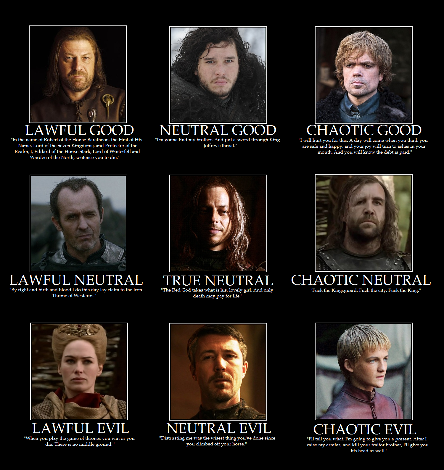 When I pointed out that Games of Thrones characters do not have alignments, you disagreed and asked me what I meant by alignment.