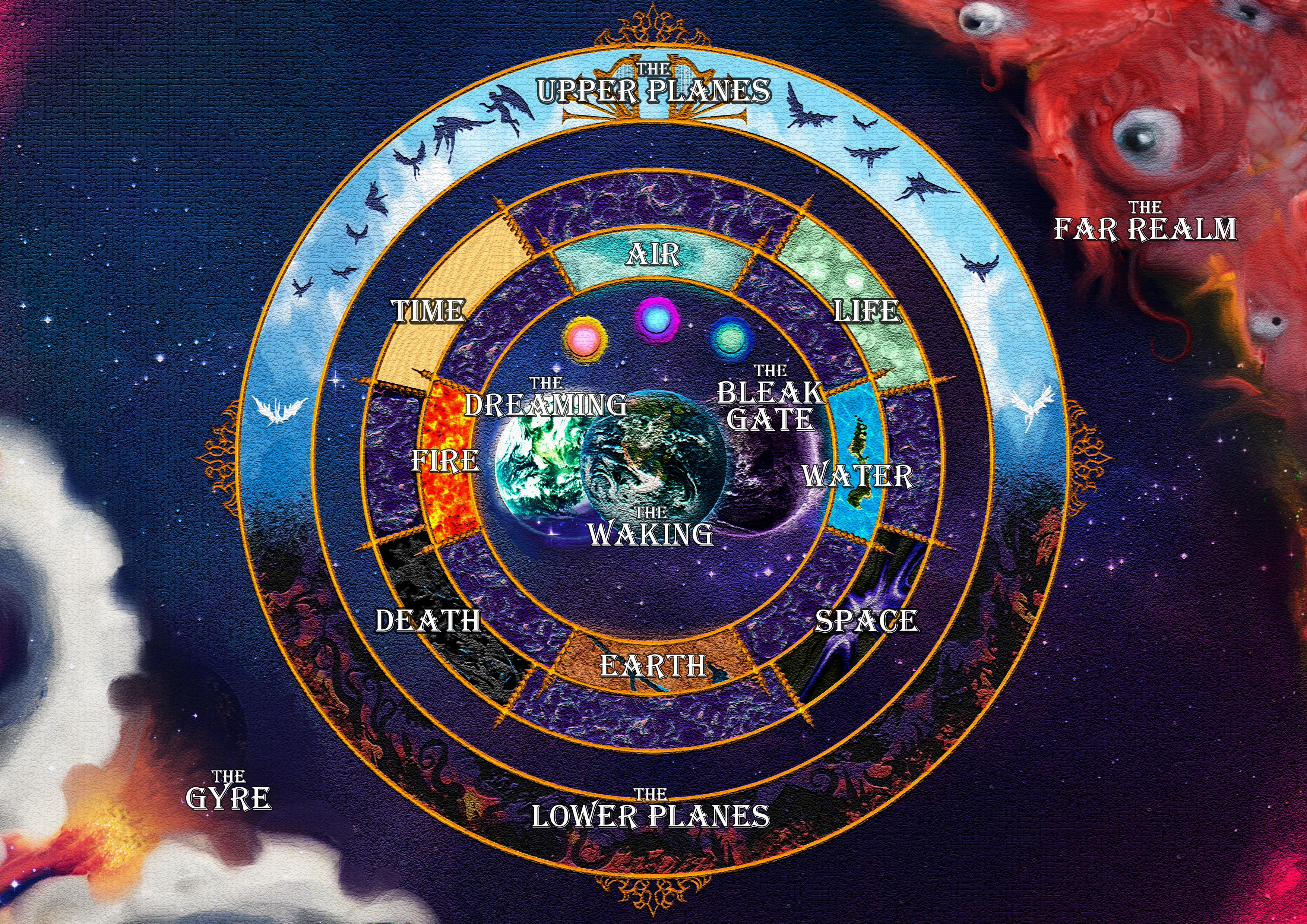 I also question the fact that life and death are in that middle layer, rather than outside the whole system as in the standard 5e cosmology of the positive and negative planes. That would seem to imply that neither life nor death hold any meaning to the outer planes, which isn't true, given gods, archdevils, demon lords, etc. have died in established lore. Unless it's a case of Schrodinger's pantheon, where the gods are in a superpositon of being both alive and dead, but I think that might raise its own problems (the idea is intruiging, though).