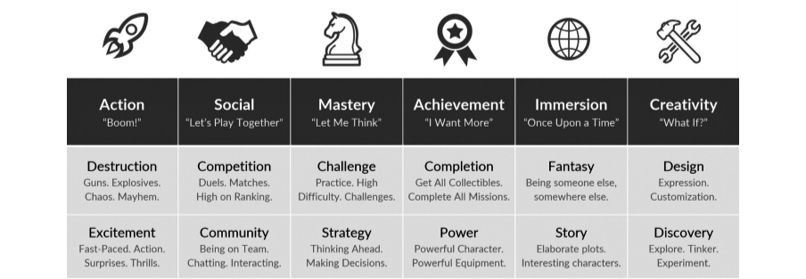 This incidentally also reveals where a lot of pain points can be coming from, given that the Immersion cluster is seemingly polarized from things like challenge and competition. A game that seeks to appeal to players motivated by these disparate elements needs to address the friction that can result between the two.