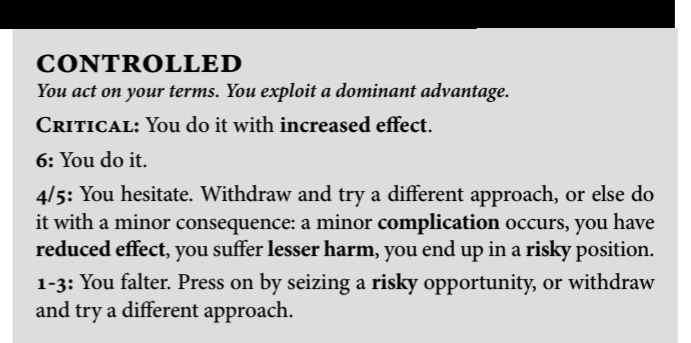 This is a variable, dice-based prompt. An unambiguous success grants practically full leeway to the Player, and the remaining results offer prompts to act upon instead to modify the intended action, with additional integrated mechanical triggers to offer up different prompts, revolving around the Position/Effect framework.