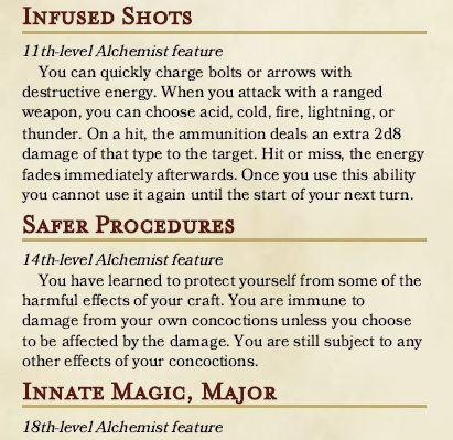 1. Many versions of the alchemist just make potions, and have nothing to do when they aren’t brewing. I wanted to make the class useful even when you have run out of your primary class feature – making alchemical items.
