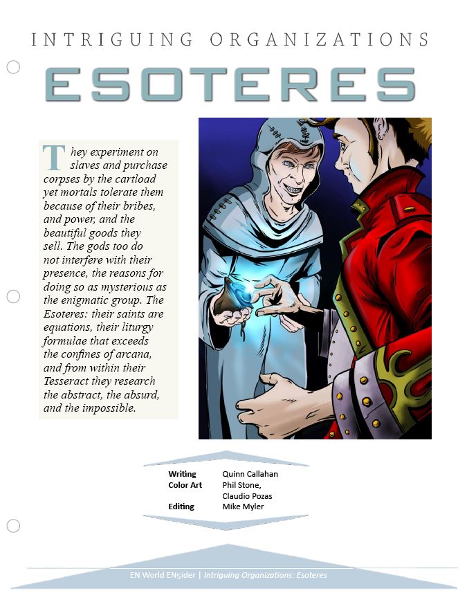 - #251. Intriguing Organizations: Esoteres. Seekers of reality's fundamental truths that are unrelenting in their pursuits, these secretive geniuses craft devices of sublime perfection and trade them for—or take—whatever it is they require to continue their dangerous experiments of discovery!
