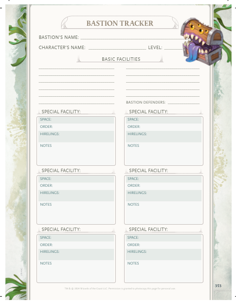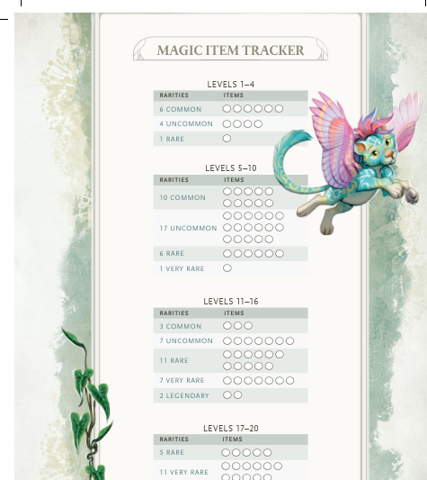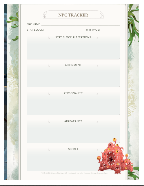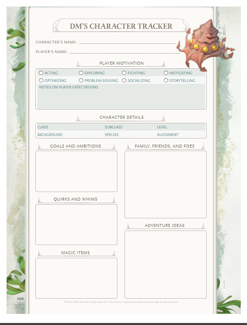 Tracking sheets in the back of the book are another DM helper. These trackers will also be available for free on D&D Beyond. One page each, they help DMs organize NPCs, Bastions, and Magic Items, plus a tracker for PCs (the DMs Character Tracker).