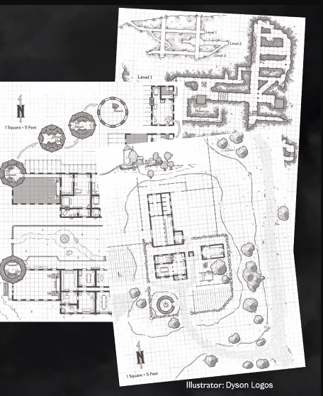 The style of these stock maps is very deliberately simple and basic, and printed in black and white to show DMs that they can draw their own maps. Some of the sample adventures in Chapter 4 will also reference the maps and give suggestions as to how to customize and modify them as needed, such as not including a section or not listing a door, to meet their needs without having to create new maps themselves for every session.