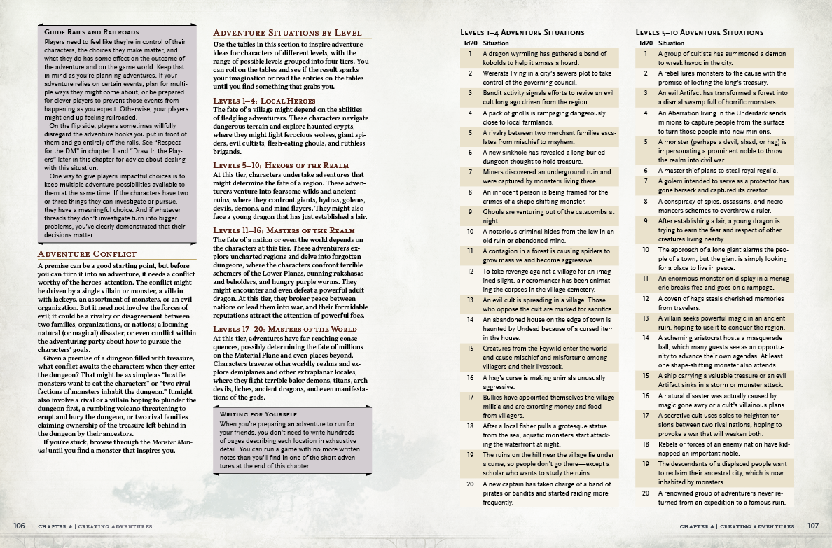 Chapter 4 has five short adventures that both serve as examples for new DMs and can be run as needed. The adventures are for level 1 characters, level 2 characters, level three, level 5, and level 7 characters to provide a range of options and to demonstrate how adventures scale up as the players level.