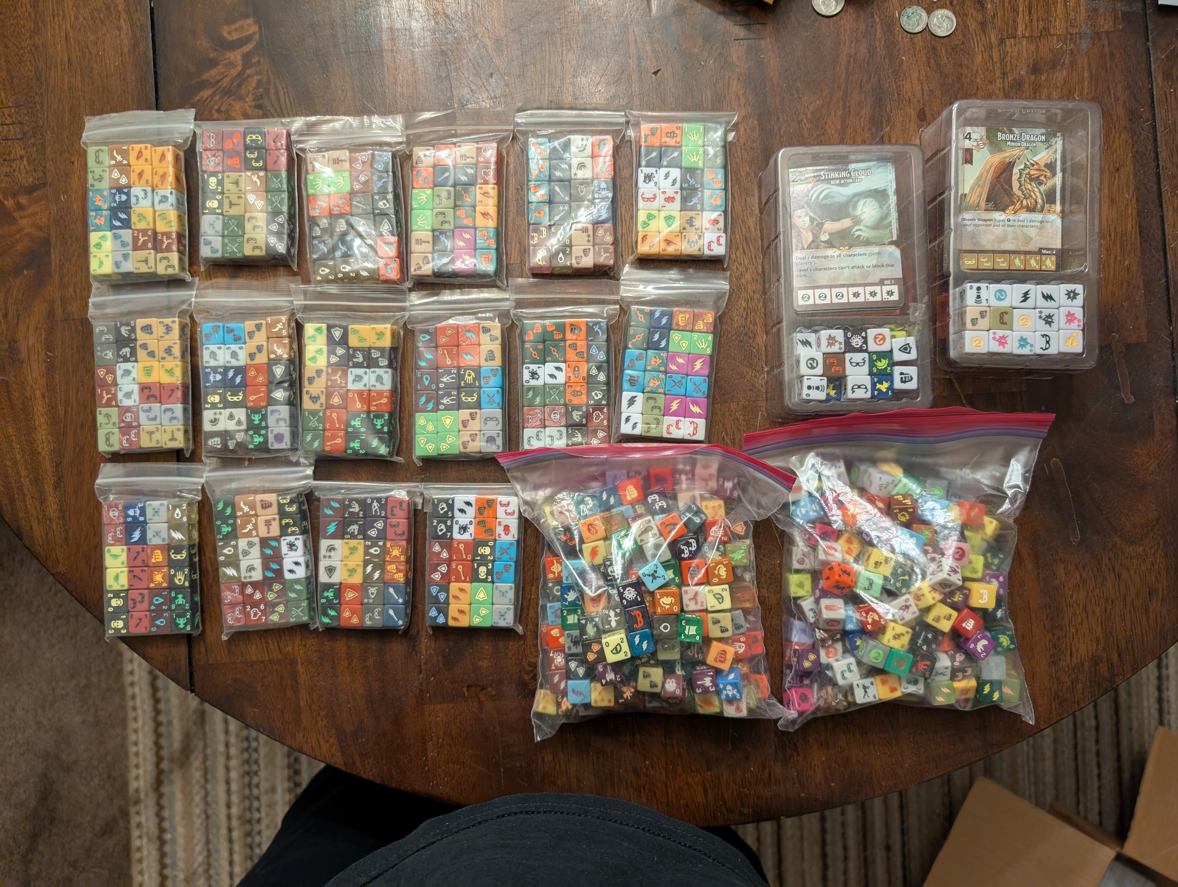 For straight sale, a HUGE lot of Faerun Under Siege and Battle for Faerun Dice Masters. Innumerable dice and dozens of cards, including many rares.