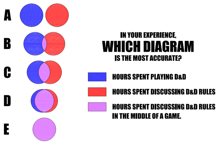 I’d say B still has too much overlap, but there is some time spent discussion rules. At my table, though, it is probably less than 20 minutes in a 4 hour session.A while ago, someone described Dungeons & Dragons to me as "thirty minutes of fun, packed into five hours." That can't be right, can it?