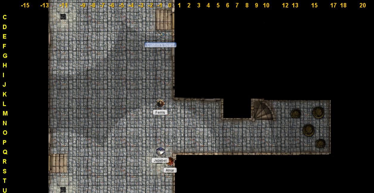 Bann-ur: Move to F5 with failed Stealth check (currently hidden in darkness), Search desk at D5-E7 (standard, Perception check = success = item 2/3 found!)