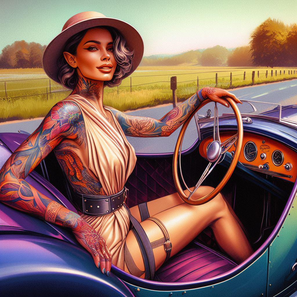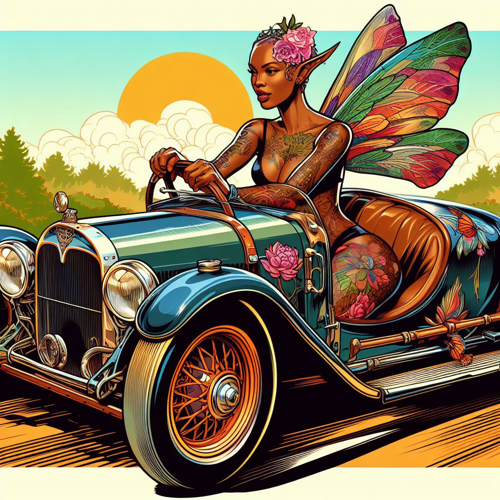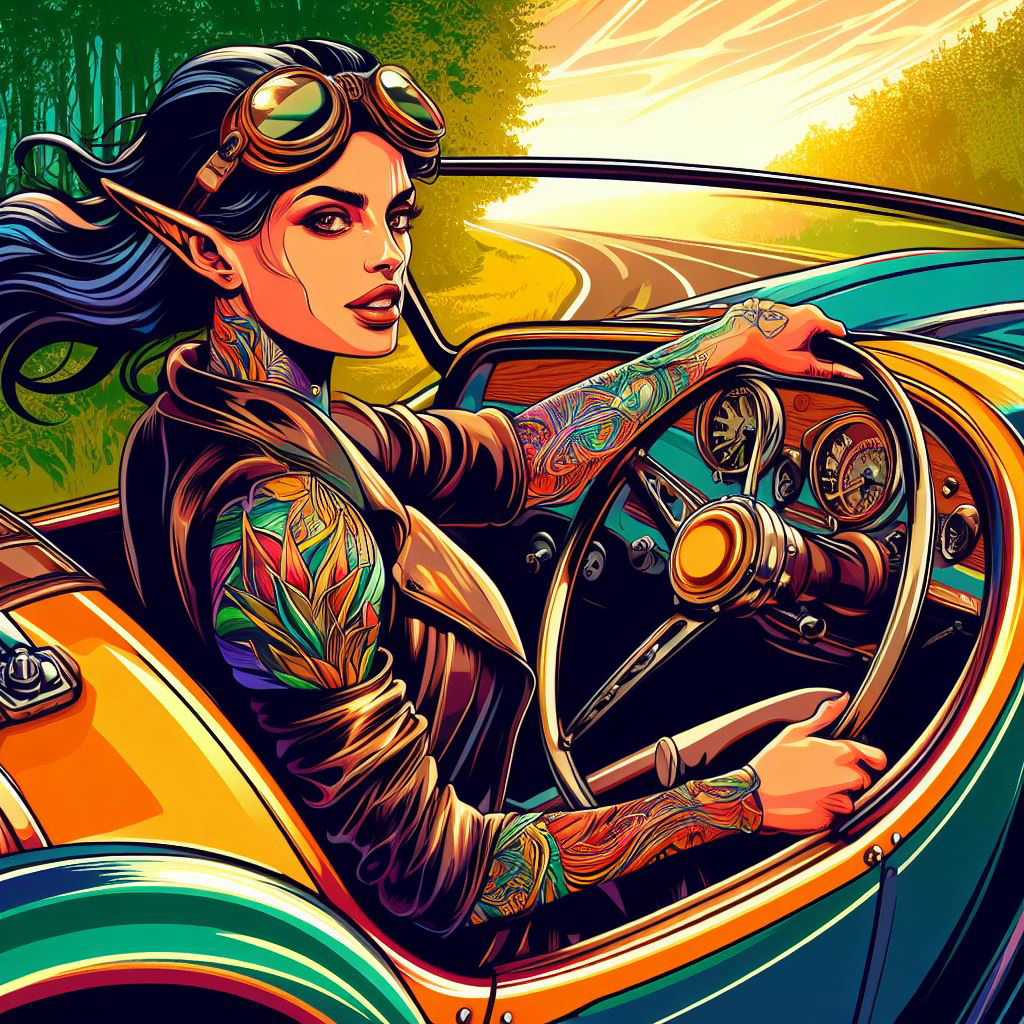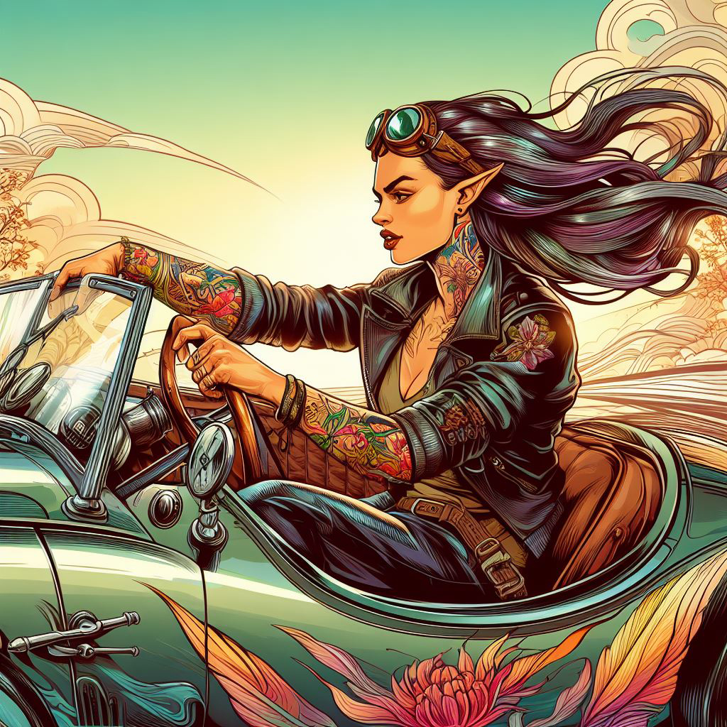 Some tattooed elf ladies taking their 1930s roadster out for a Sunday drive: