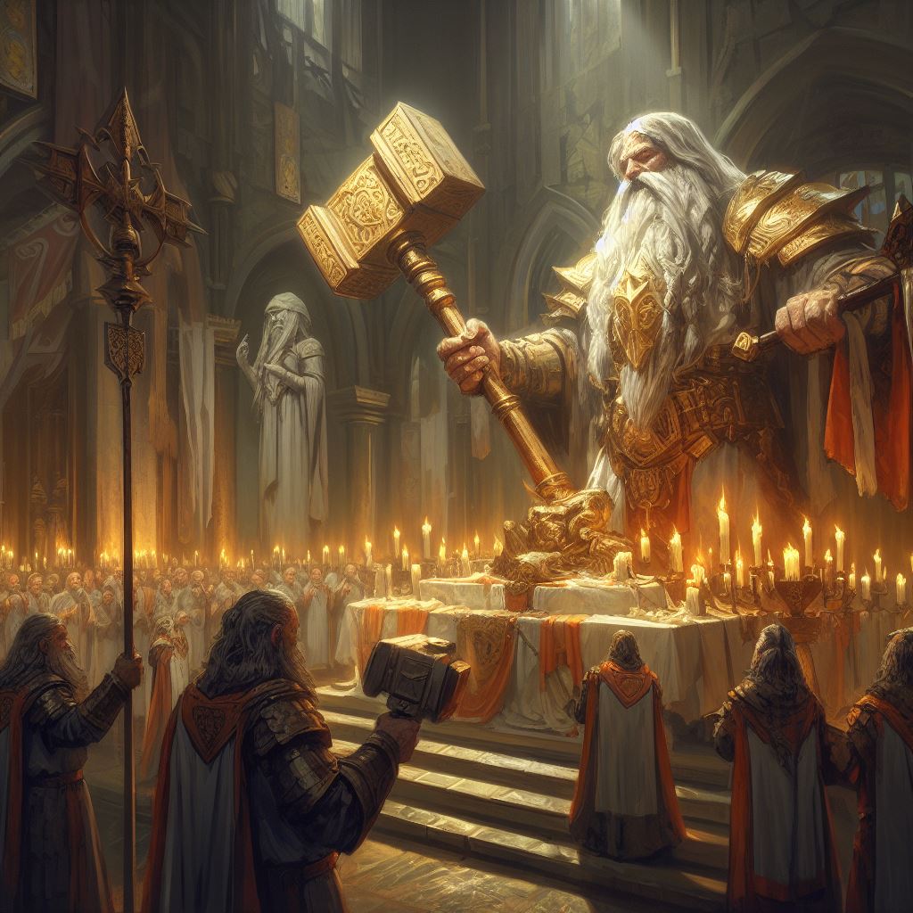 Dwarven priests celebrate mass with a hammer at an altar wirh a statue of an ancient dwarven warrior, high quality digital painting