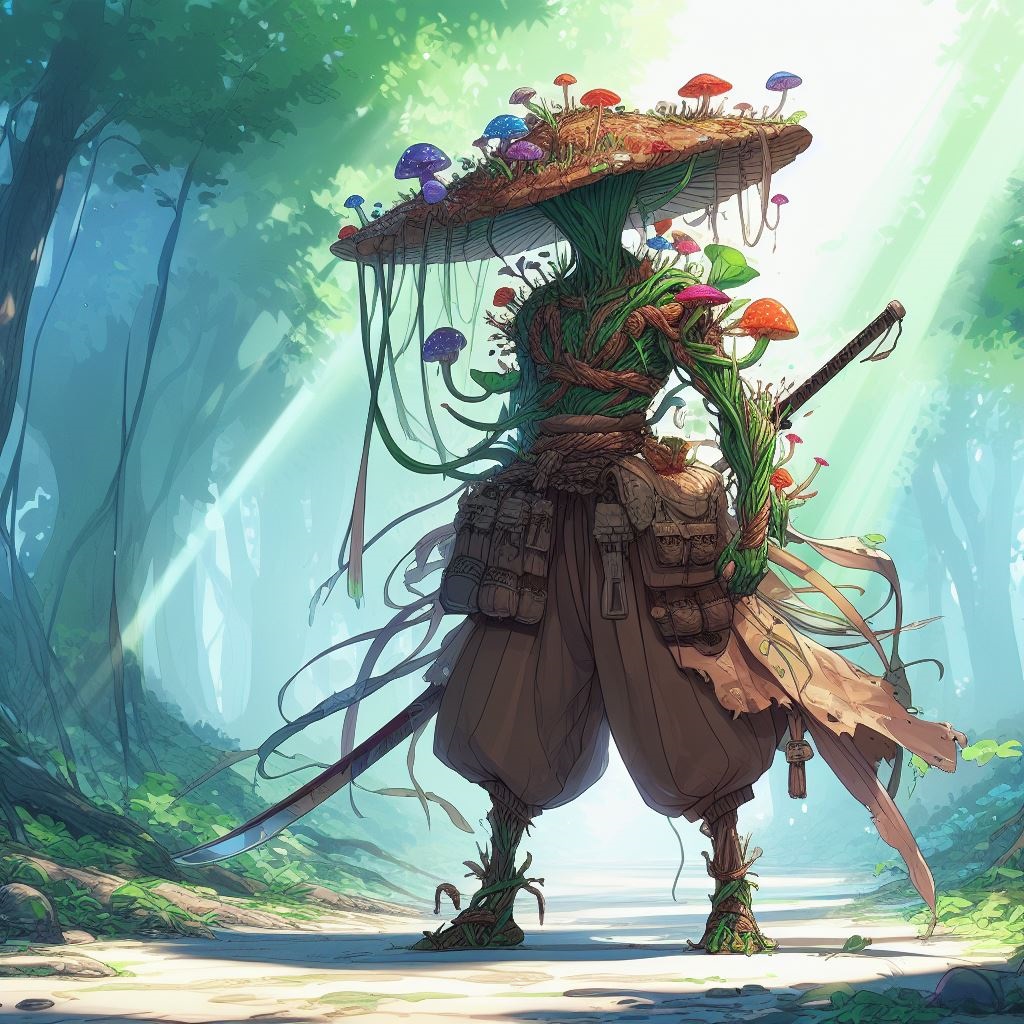 PROMPT: Photo-realistic digital art depicting the Escher-esque creature resting near a colossal ancient tree in the heart of the enchanted forest. The tree's roots seem to intertwine with the creature's limbs, creating a harmonious blend of nature and surrealism. Luminescent flowers and mushrooms light up the scene.