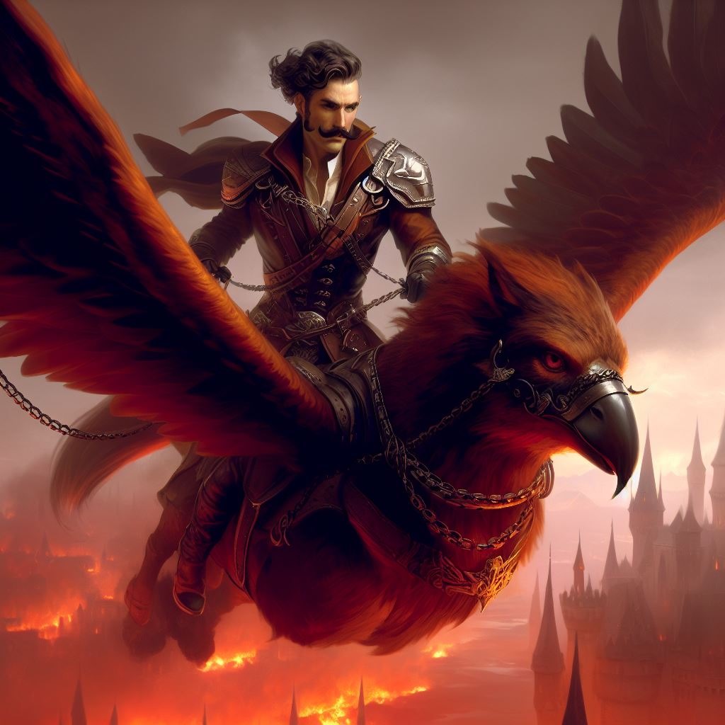 Our dashing Skald, Hannibol riding his grandfather's Hippogriff, Waxwane over the burning Hellturel: