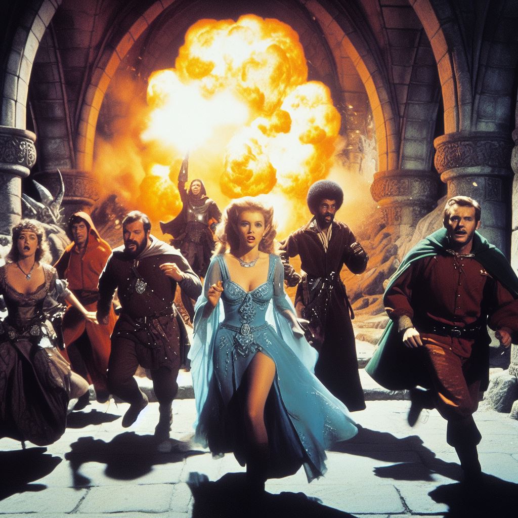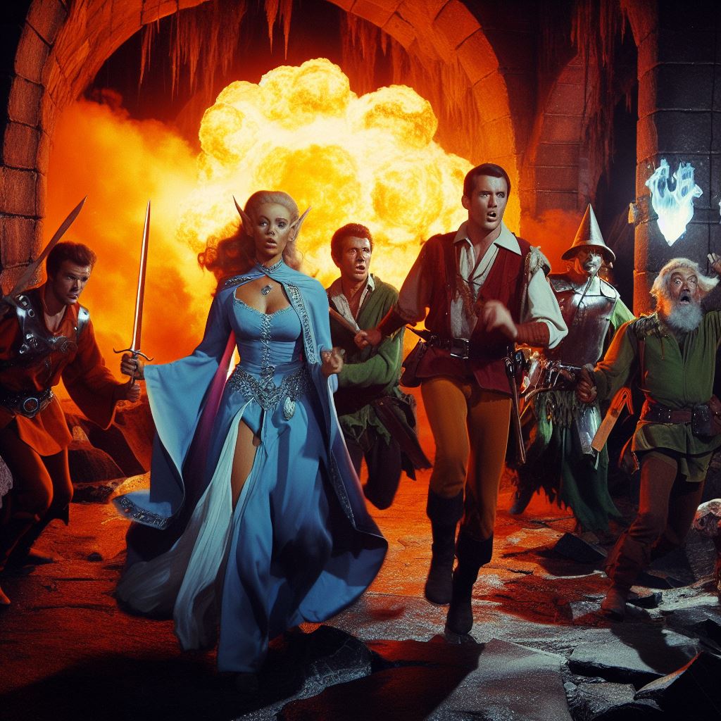 Was not expecting a cameo by the Tin Woodman.1960's technicolor hollywood epic. a D&D group including an Elven lady mage in well fit robes, a tall human warrior, a D&D Halfling thief, and a Dwarven Cleric run through a dungeon being rocked by explosions, yelling.