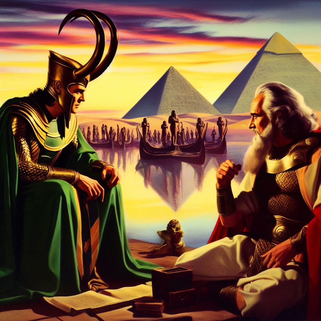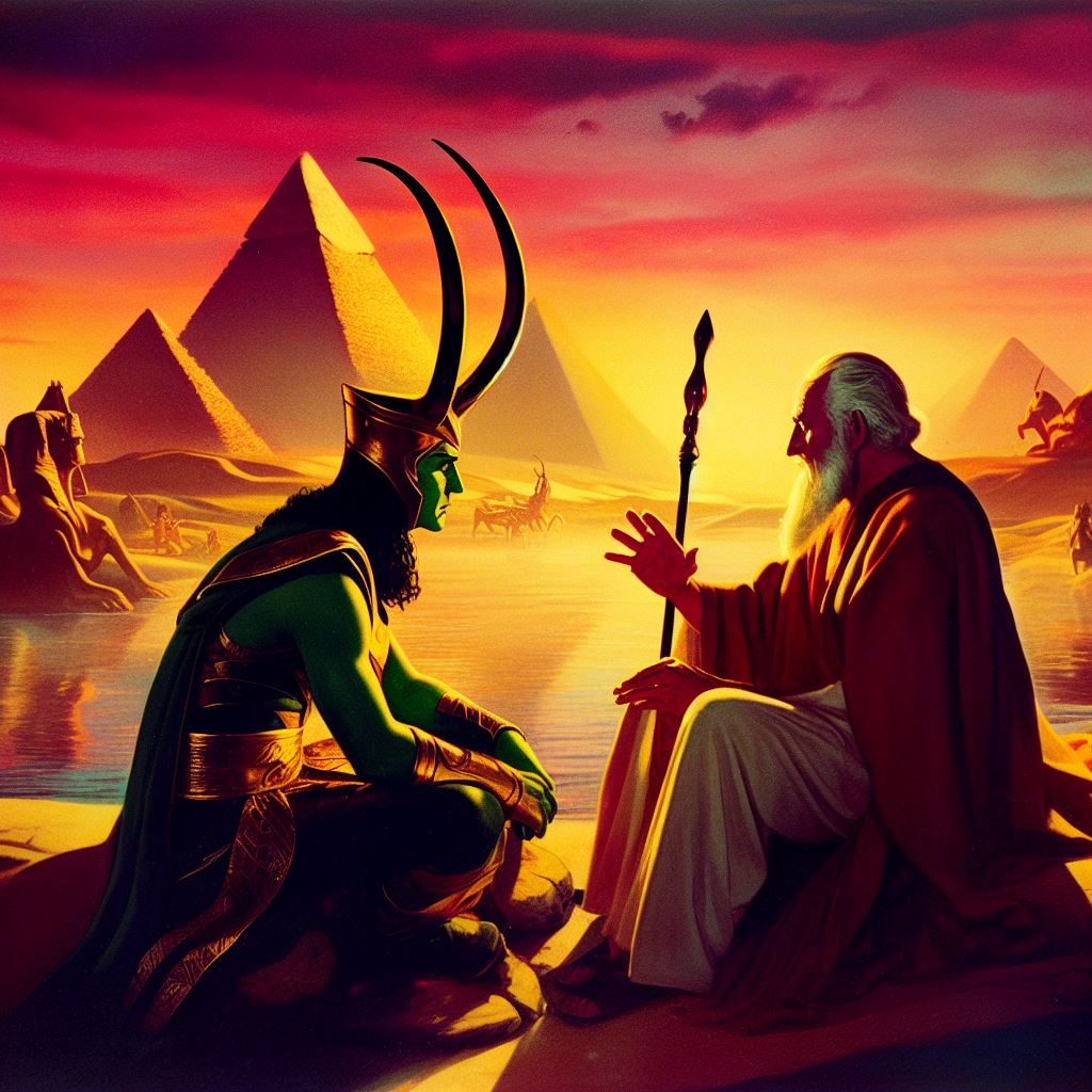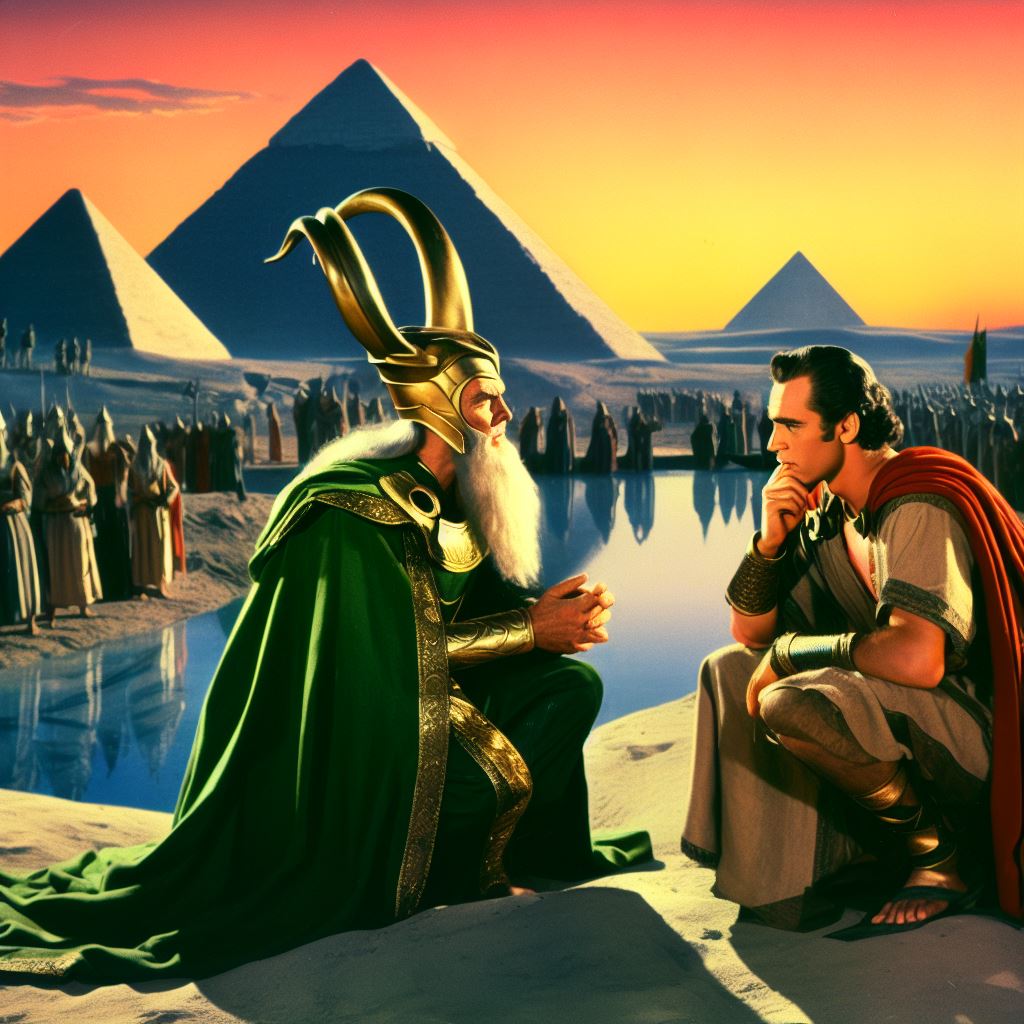 Man, Loki and Moses became such bros that they swapped attire in that last one!1950's technicolor hollywood epic. Loki and Moses deep in discussion, evening banks of the Nile with Pyramids in the background