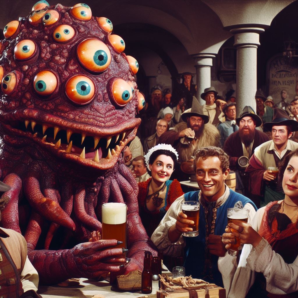 1950's technicolor hollywood sci-fi epic. gigantic isopod covered in octopus eyeballs drinks a beer in a crowded D&D tavern, all the other patronz look on in bewilderment