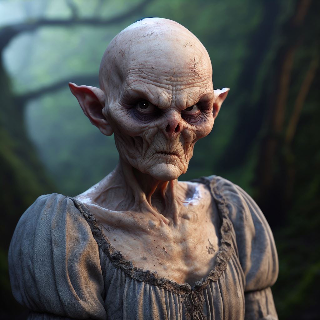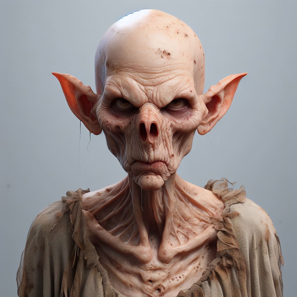 bald emaciated wrinkley pimply flabby Elf lady with asymmetrical facial features and a skeleton nose wearing a frumpy dirty dress scowling and leering at the camera, gorest glade, high quality digital paintingHere is adding "warts and bad skin"