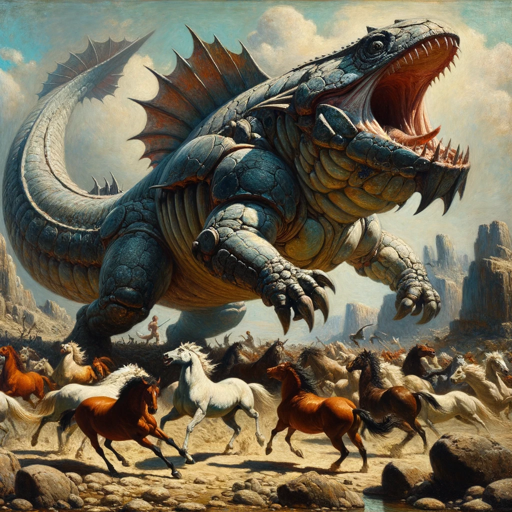 1. Oil painting of a massive bulette with the body of an armored lizard and a shark-like head, bursting dynamically from rugged terrain, its jaws open wide showing sharp teeth. Diverse horses rear up in panic nearby. The environment consists of rocks and sparse vegetation with a pale blue sky. The midday sun casts deep shadows, and the scene is inspired by the Romantic era with thick brushstrokes emphasizing the raw emotion and the bulette's armored scales.