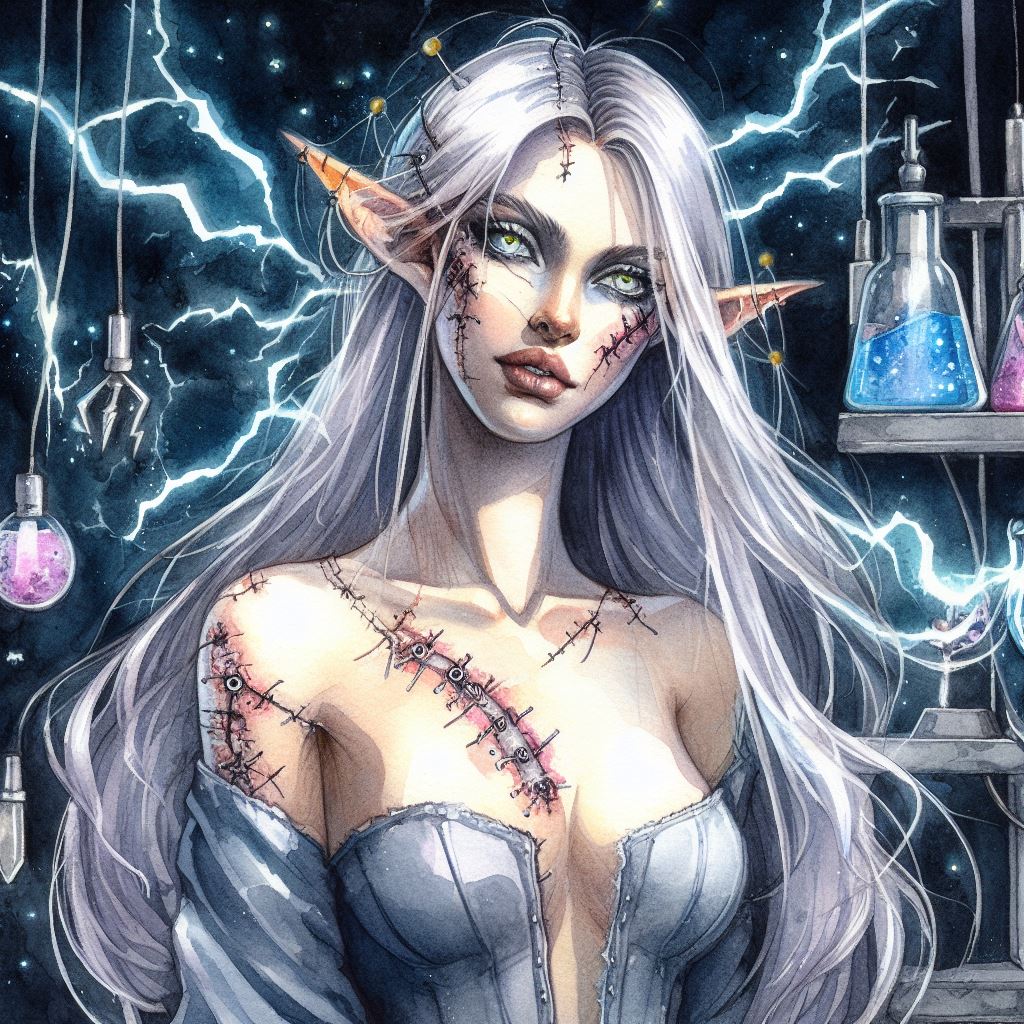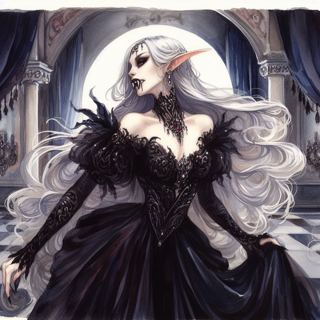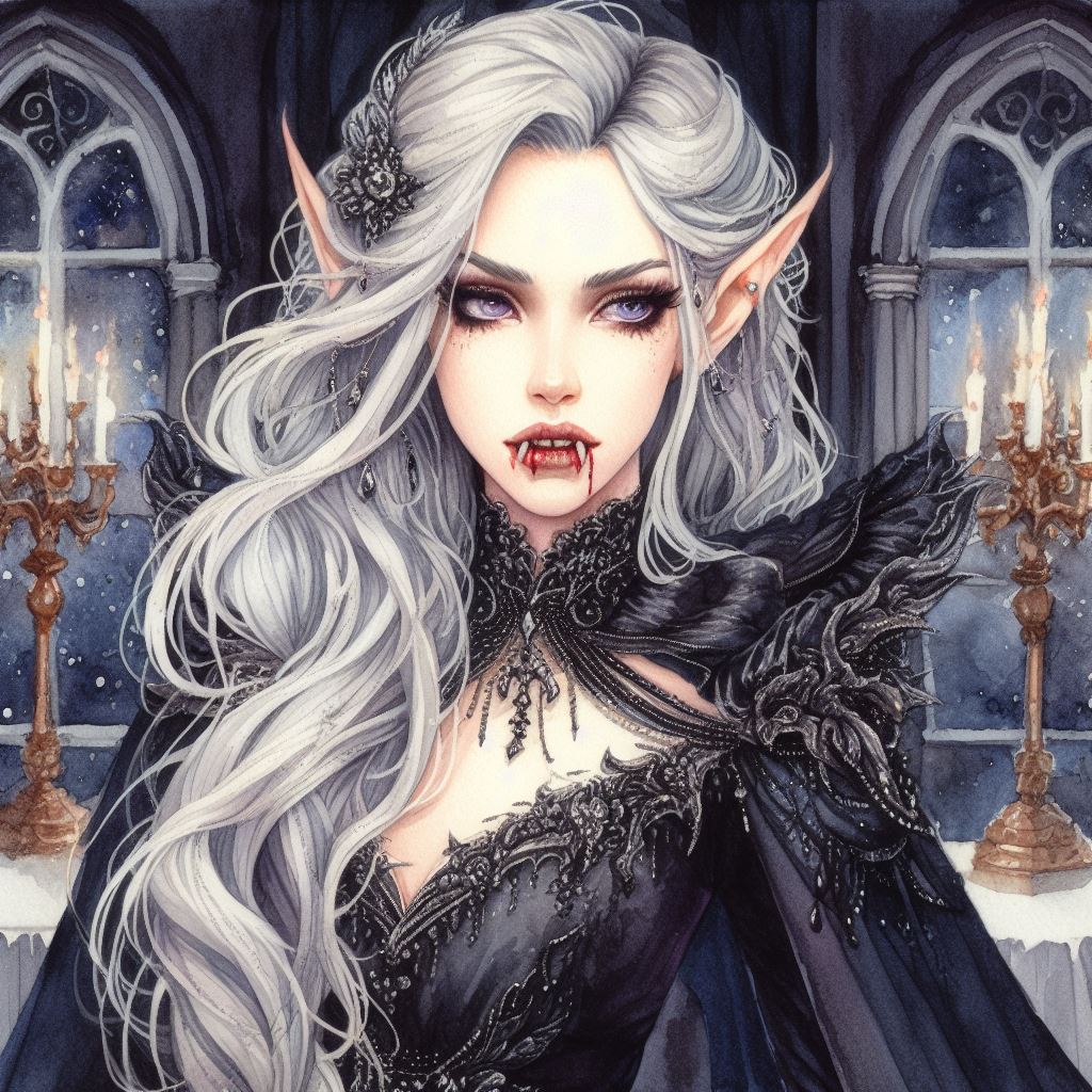 I just said "fangs", and let concept bleed handle everything else. The entire prompt was "watercolor, elven priestess of the moon with long silver hair, fangs, black gown, gothic ballroom setting."Did you specify vampire teeth or something for the dhampir? I couldn't get it to give me pointy upper teeth for my shifters. It always insisted on pointy lower teeth. I wonder if adding "vampire teeth" or something might work.