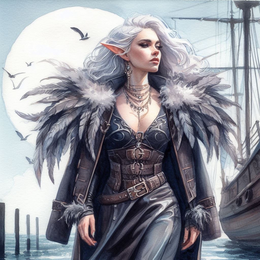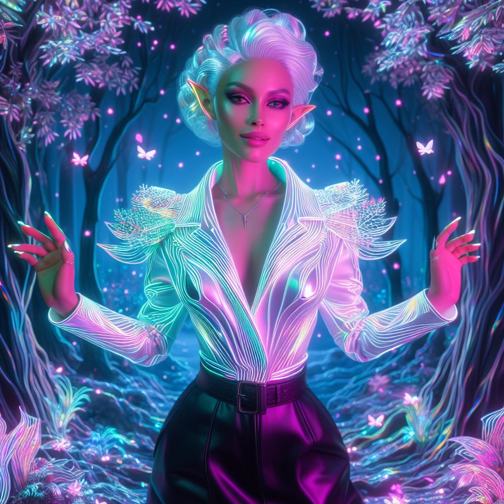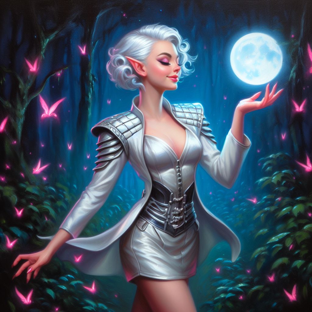 oil painting, art Deco, elven priestess of the moon with short crimped silver hair, updo, white leather jacket with shoulder pads, leather skirt, high heels, neon palette, casting a spell, fantasy forest setting, surrounded by pink fireflies, serene smileWhat's the prompt there?