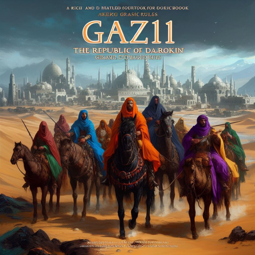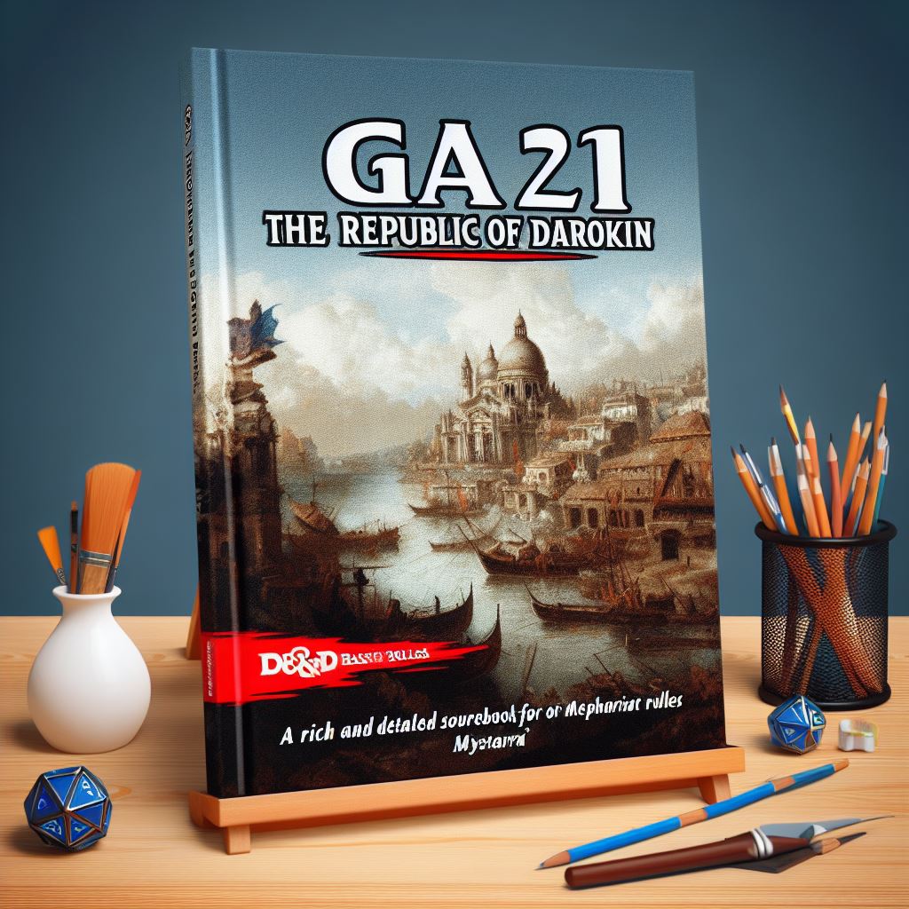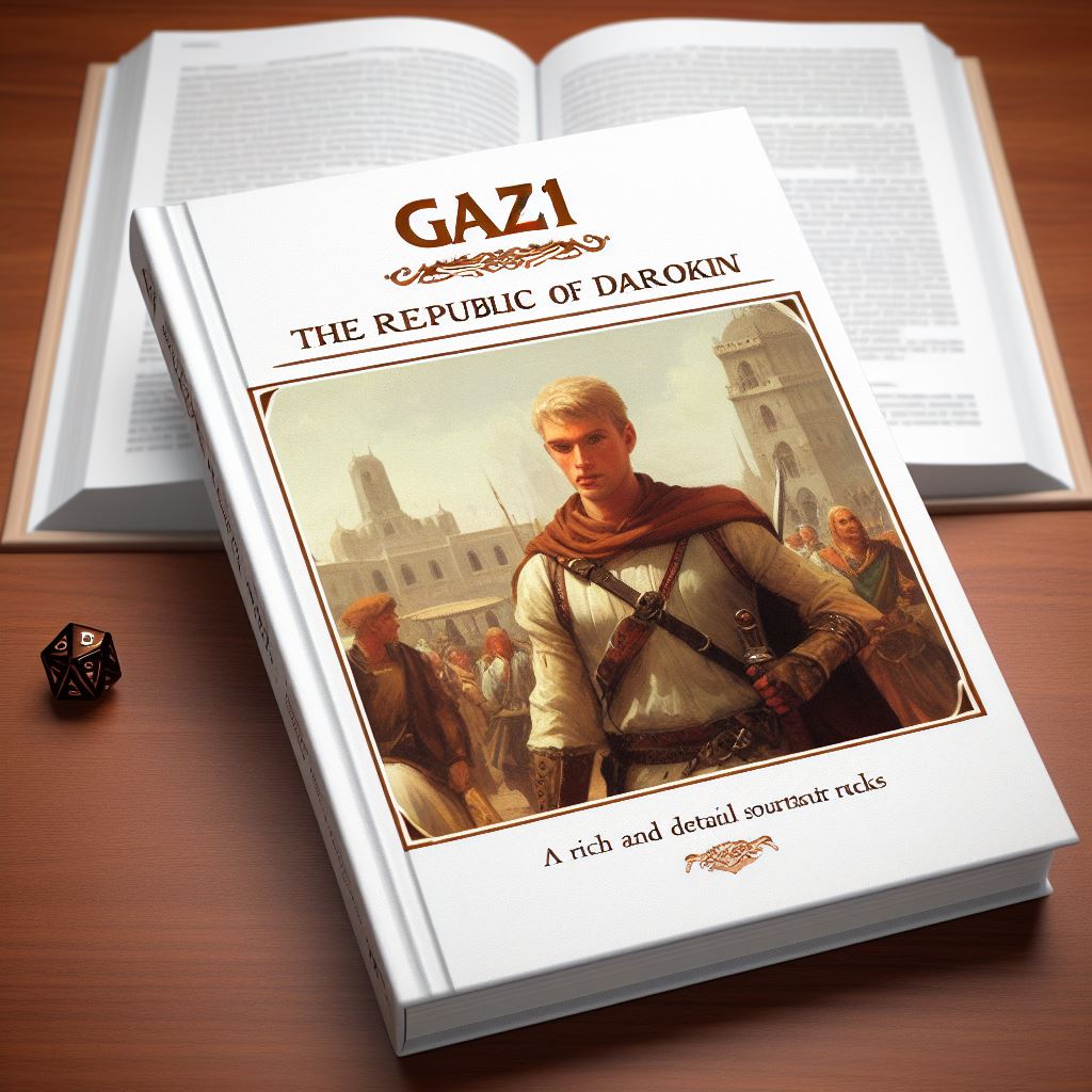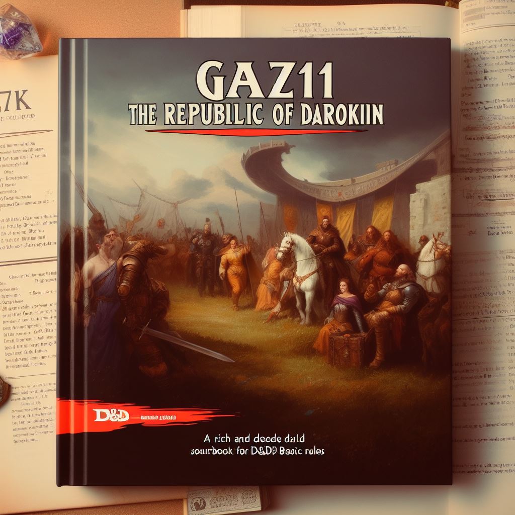 An AI prompt to draw a book cover similar to Gaz11 The Republic of Darokin, a D&D module about the history, politics, and culture of a merchant republic in the world of Mystara, in the style of a realistic painting, with the title 'Gaz11 The Republic of Darokin' and the tagline 'A rich and detailed sourcebook for D&D Basic rules'.