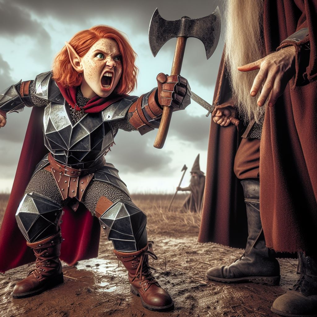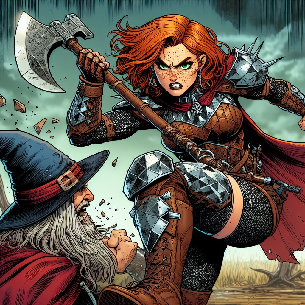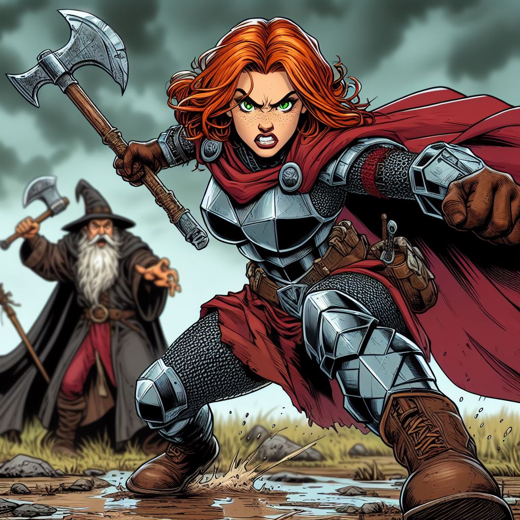 Prompt: Modern comic book style. An action shot of a pale freckled short squat robust athletic ginger-haired green-eyed fantasy dwarf woman angrily hitting an evil wizard with her battleaxe. The dwarf wears blocky geometric metal and leather fantasy armor with black chainmail tights, a crimson cloak, and smooth brown deerskin boots. Backdrop is a blurred muddy field beneath a stormy sky.