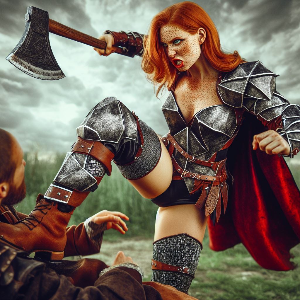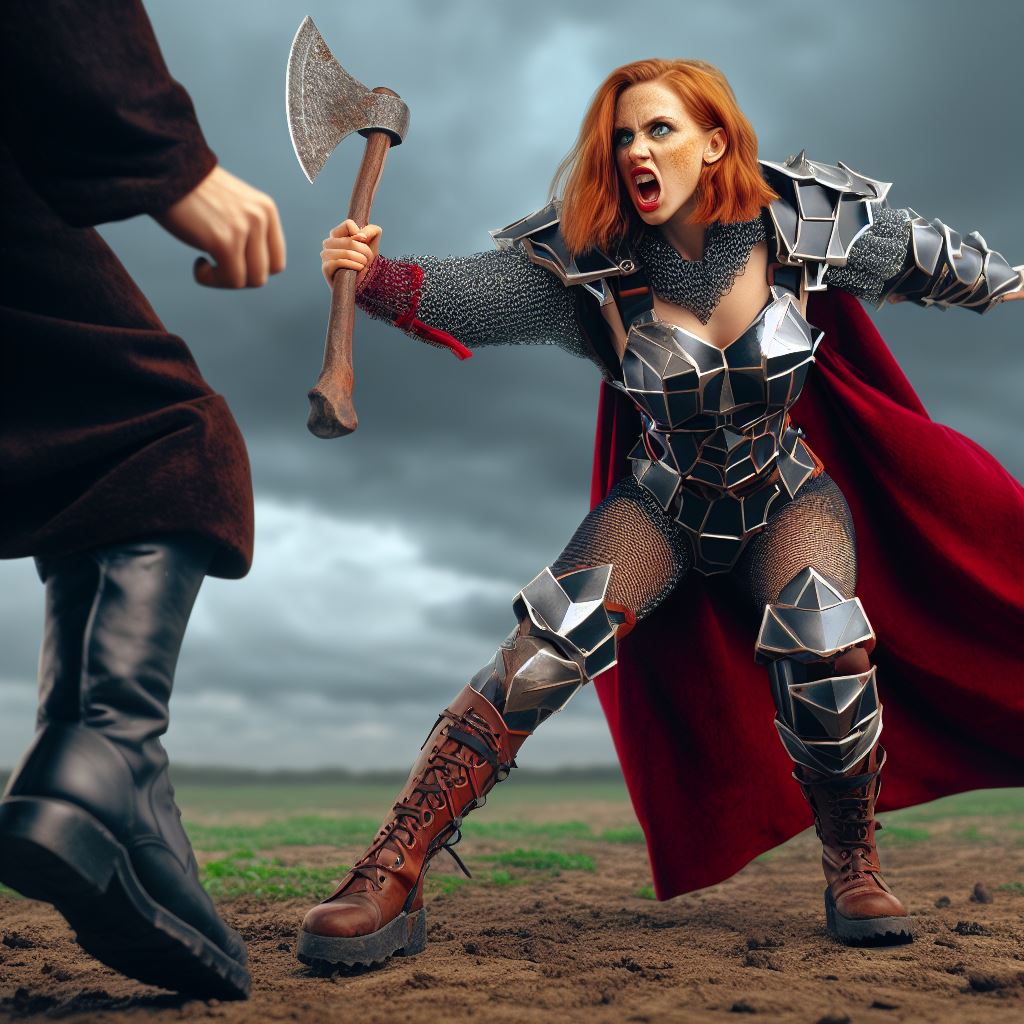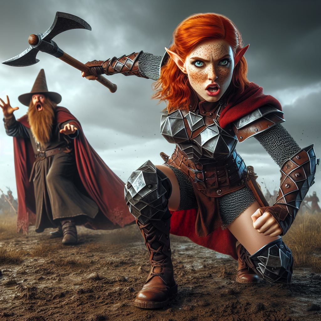 Prompt: Modern comic book style. An action shot of a pale freckled short squat robust athletic ginger-haired green-eyed fantasy dwarf woman angrily hitting an evil wizard with her battleaxe. The dwarf wears blocky geometric metal and leather fantasy armor with black chainmail tights, a crimson cloak, and smooth brown deerskin boots. Backdrop is a blurred muddy field beneath a stormy sky.