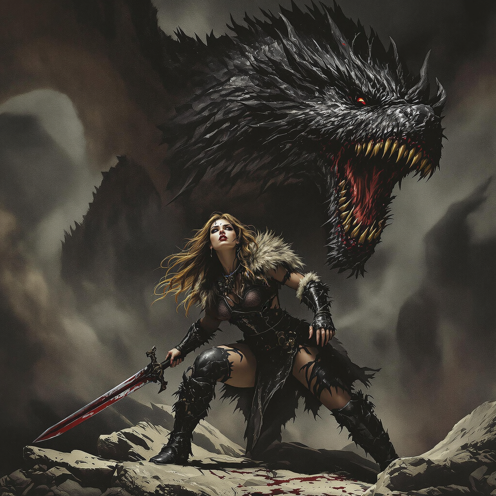 Prompt: Dark gritty fantasy, oil painting style, epic battle scene of a fierce woman barbarian slaying a colossal dragon, tattered fur-lined armor, muscular yet voluptuous physique, deep cleavage, bare midriff, powerful stance, flowing wild hair, intense expression, bloodied greatsword, dynamic pose, inspired by Frank Frazetta and Brom, moody atmospheric lighting, rich textured brushstrokes, dramatic contrast.