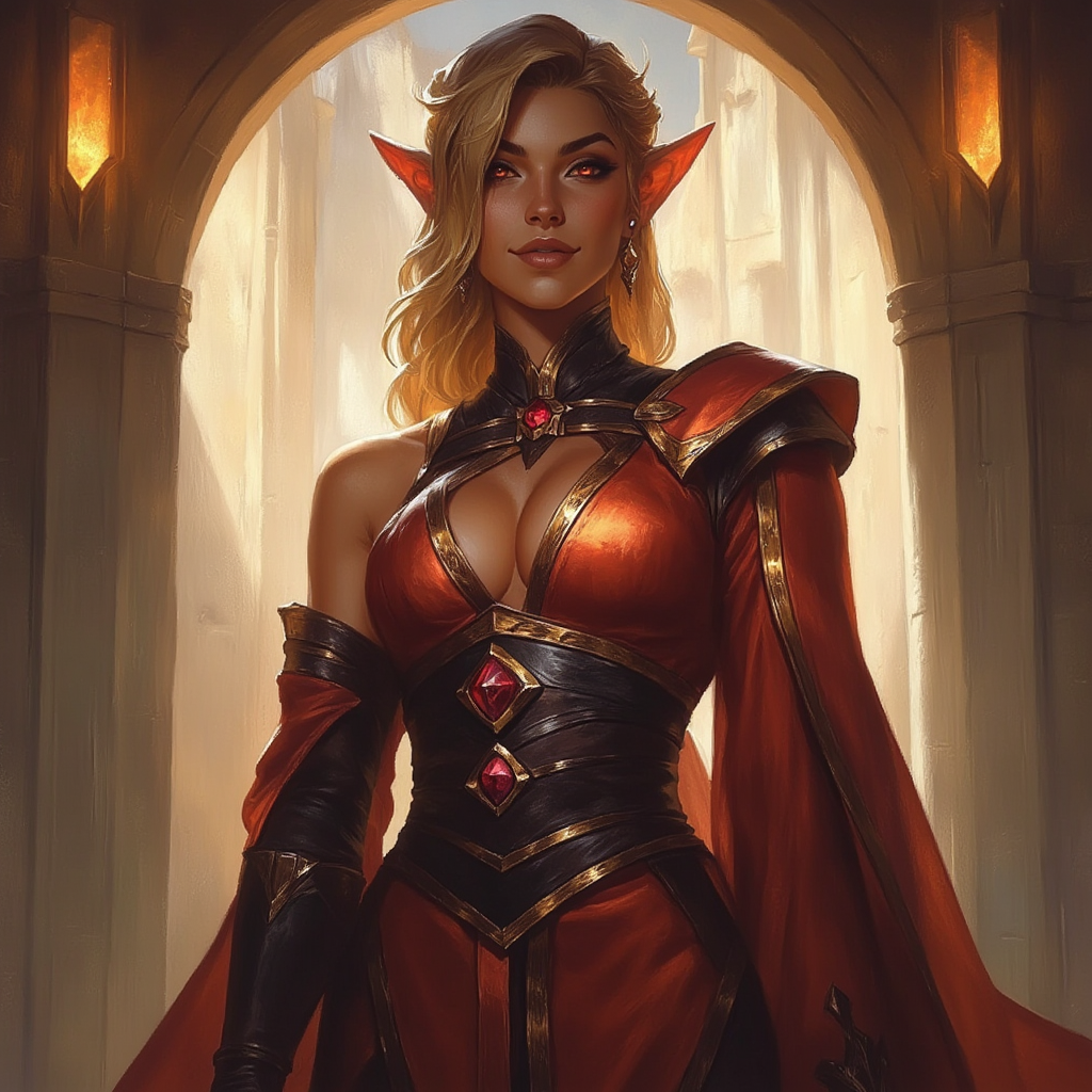 Prompt: Half-elf cleric close up portrait, soft caramel skin, copper-red silk vestments with black velvet trim and a ruby pin. Mischievous smirk. Almost plain backdrop with copper and charcoal splashes, rich painterly oil style.