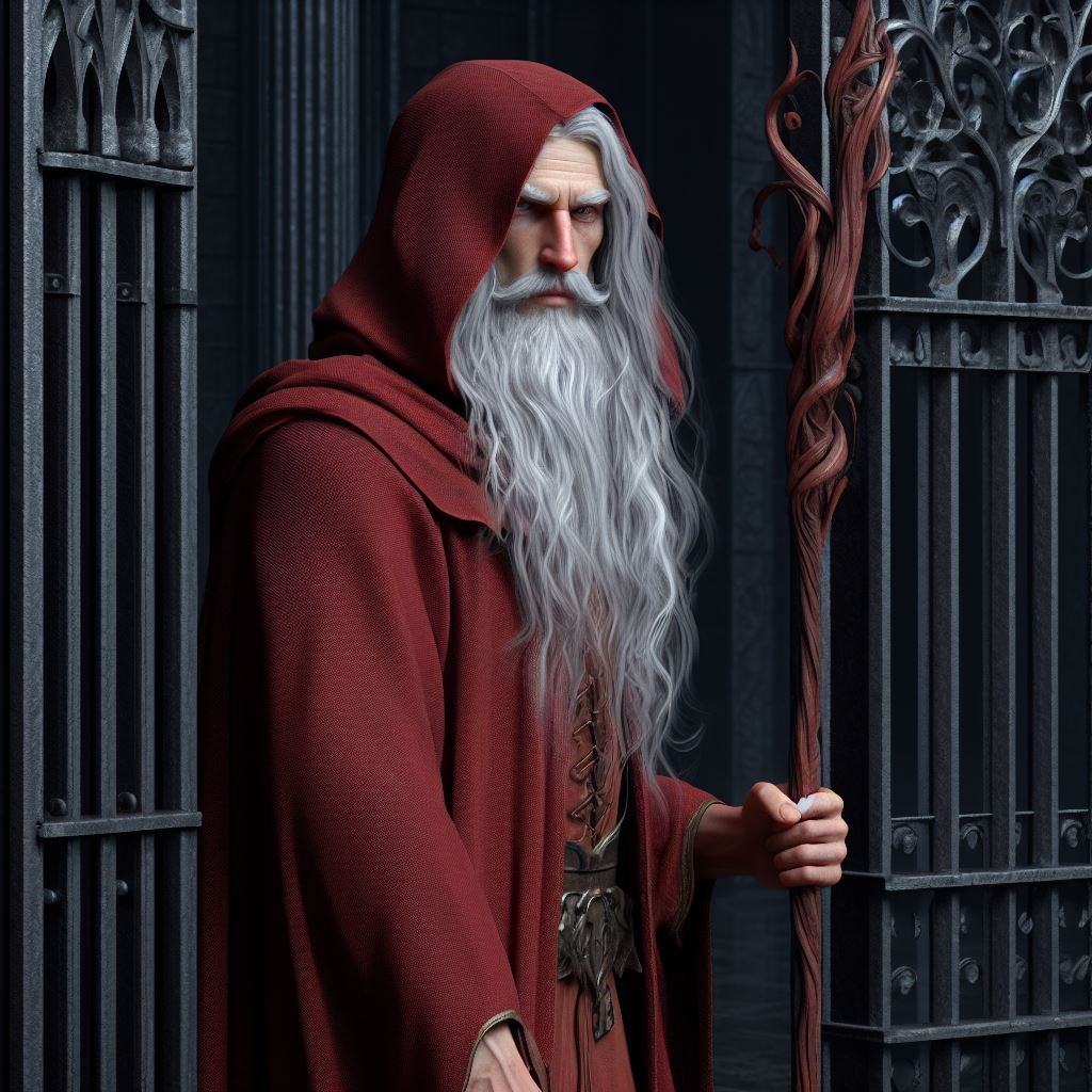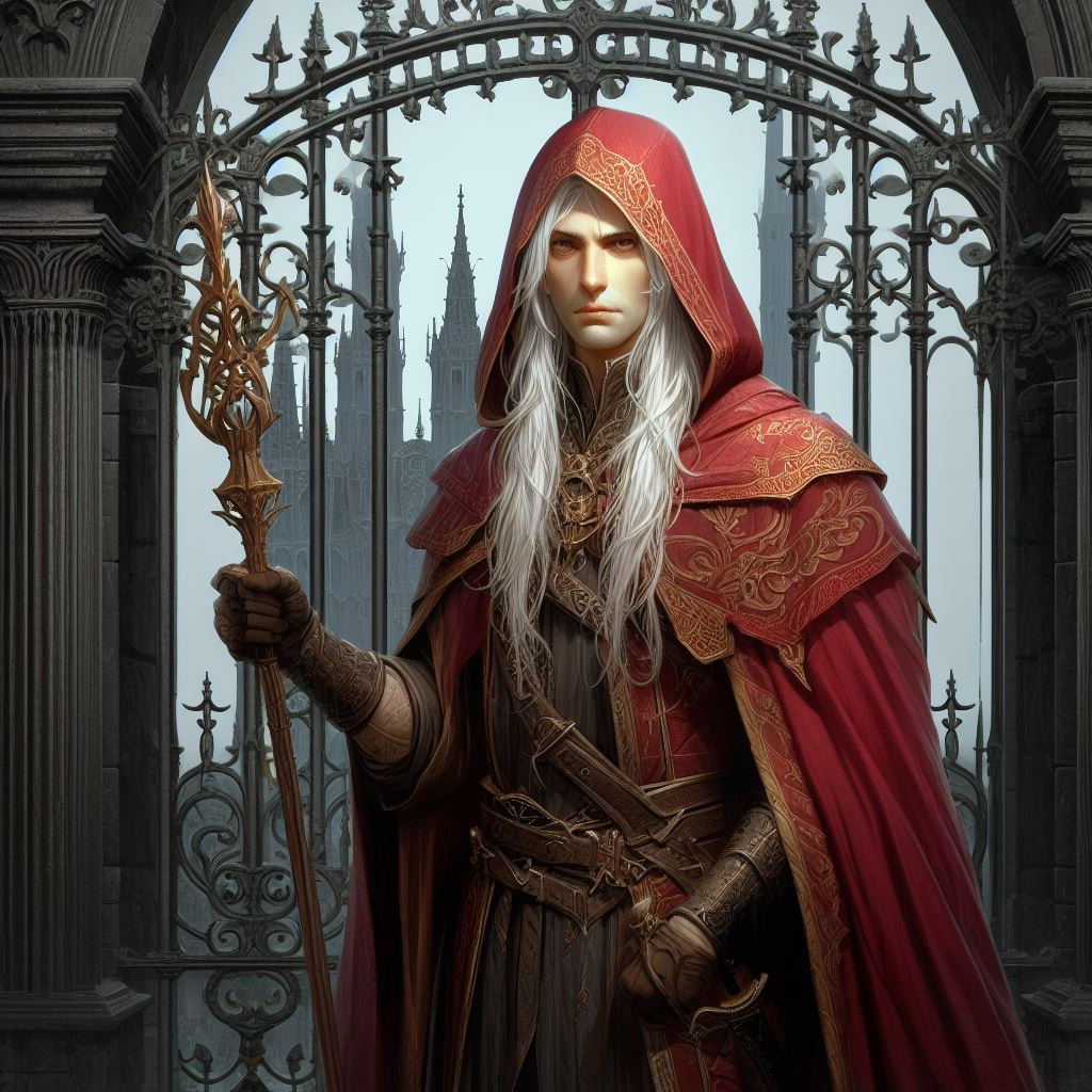 Isn't Raistlin young? Why "middle aged"?male human, middle aged, long white hair, slight yellow skin, vertical pupils, red hooded robes, holding a staff, standing at a iron wrought gate, black tower in the back, high detail digital painting
