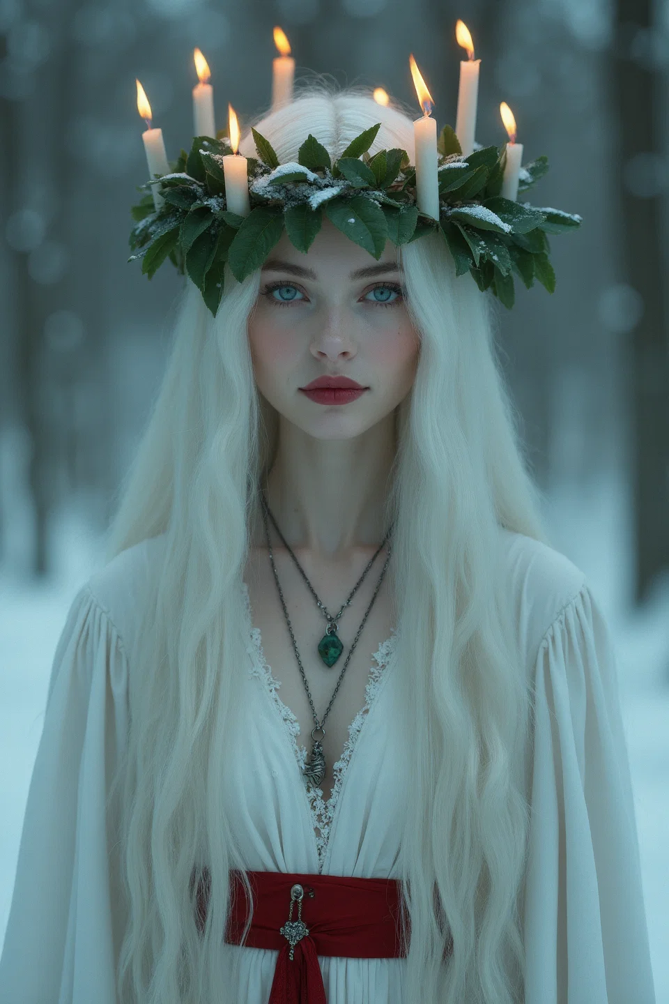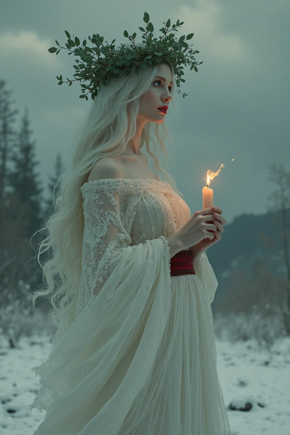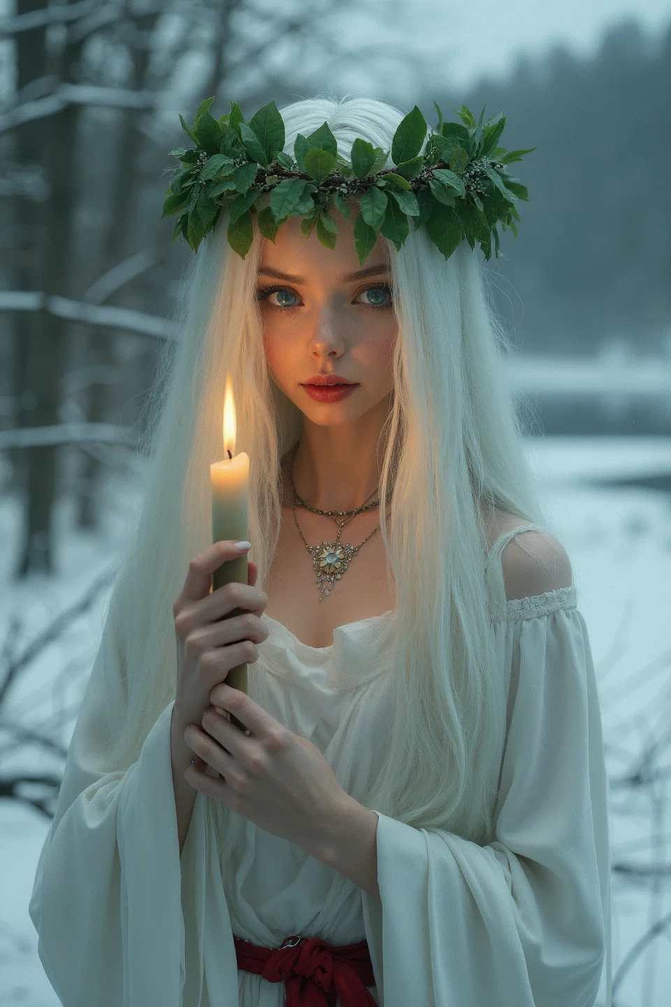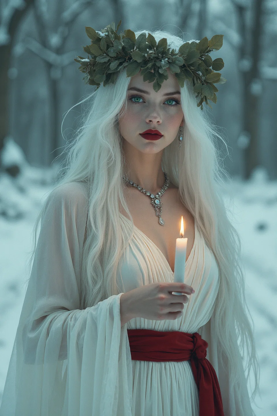 Lexica.art. The Prompt: "Attractive petite woman with very long white hair, intense emerald green eyes, dark red lips, jewellry. She has a wreath of leaves on her head, and she is holding a burning candle. She is dressed in white with a broad red belt. Wintery landscape. Saint lucia."