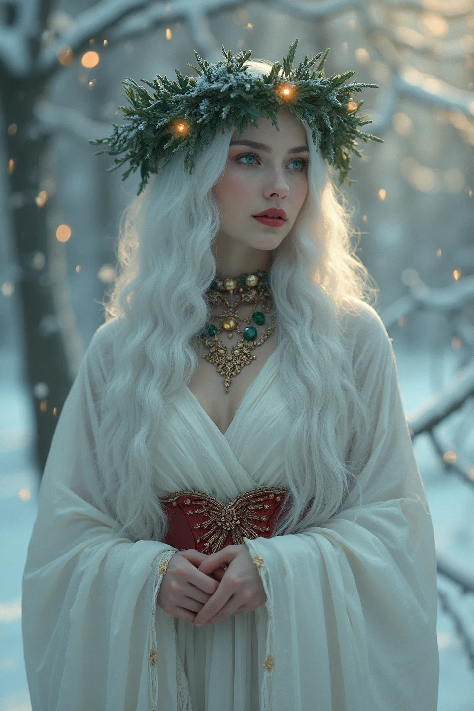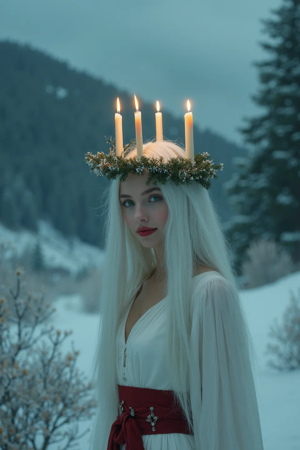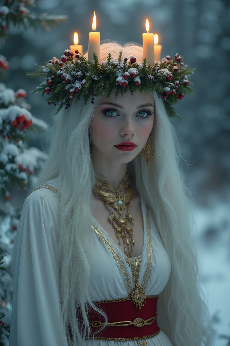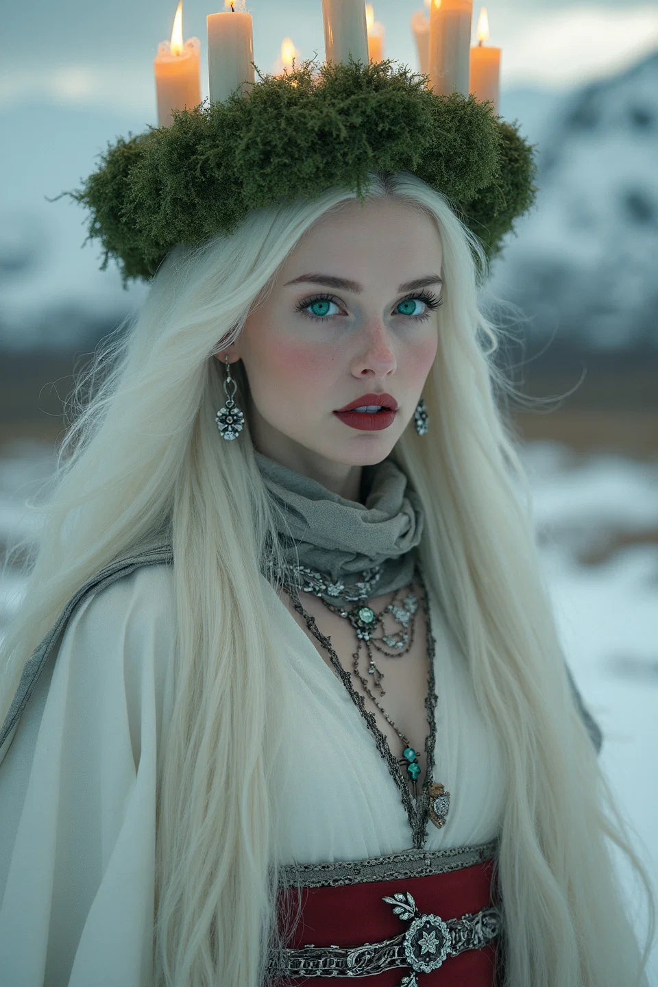 Lexica.art. The Prompt: "Attractive petite woman with very long white hair, intense emerald green eyes, dark red lips, jewellry. She has a wreath of leaves on her head, and she is holding a burning candle. She is dressed in white with a broad red belt. Wintery landscape. Saint lucia."
