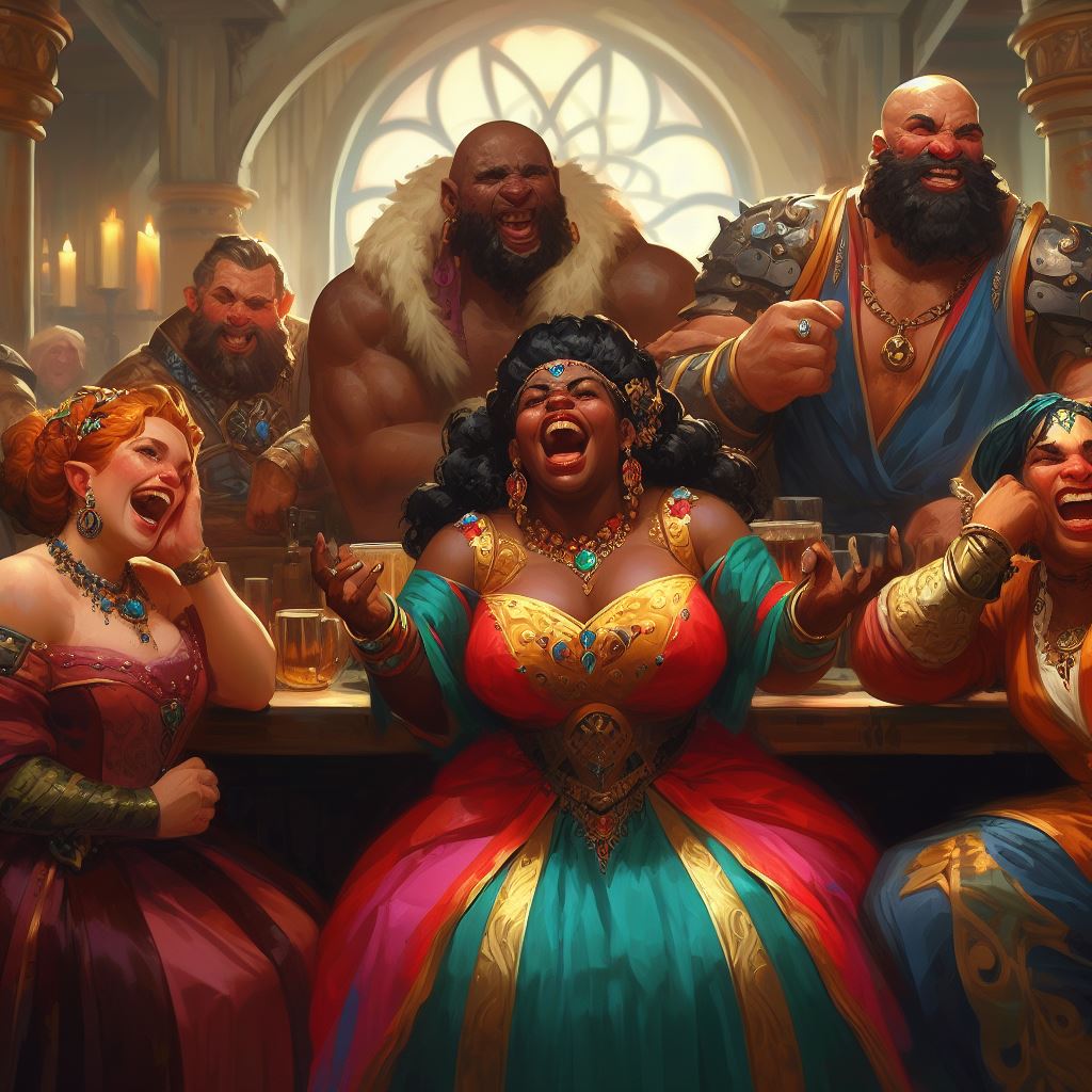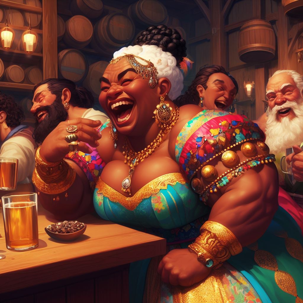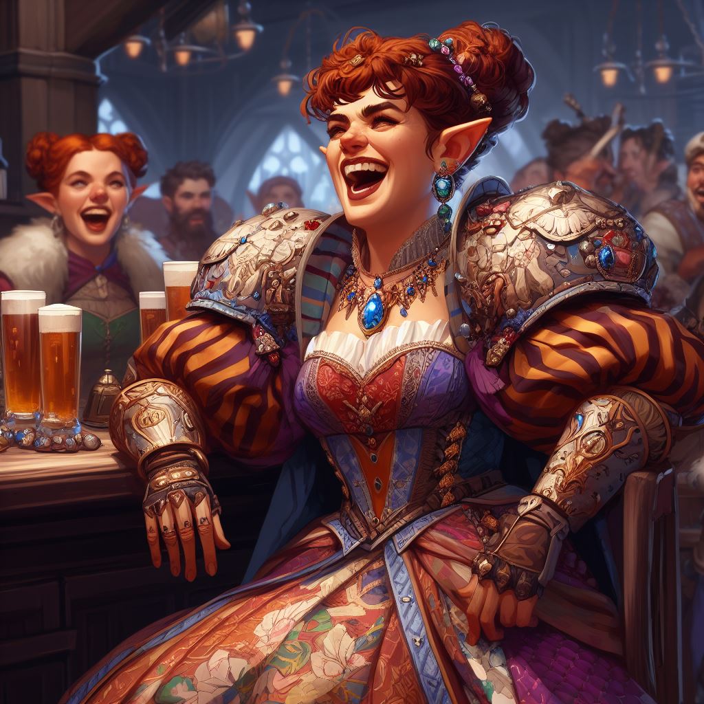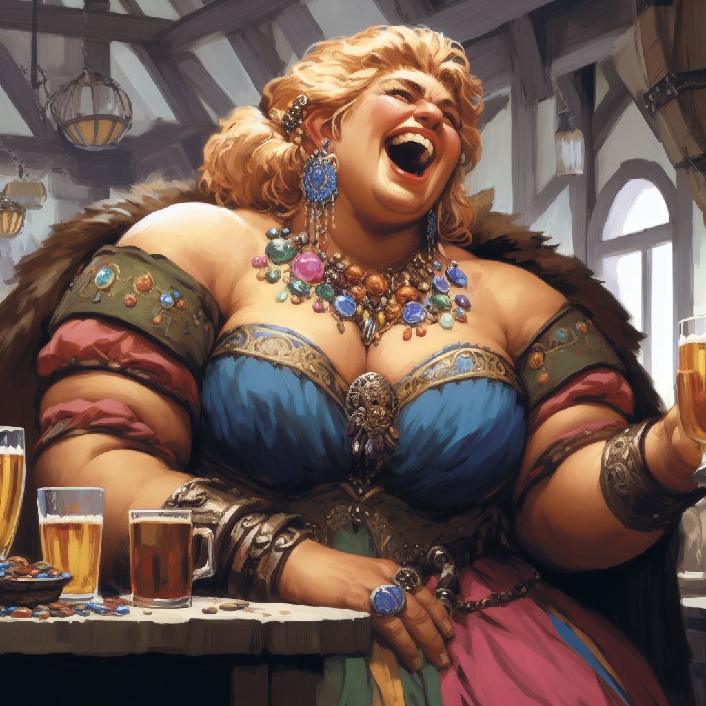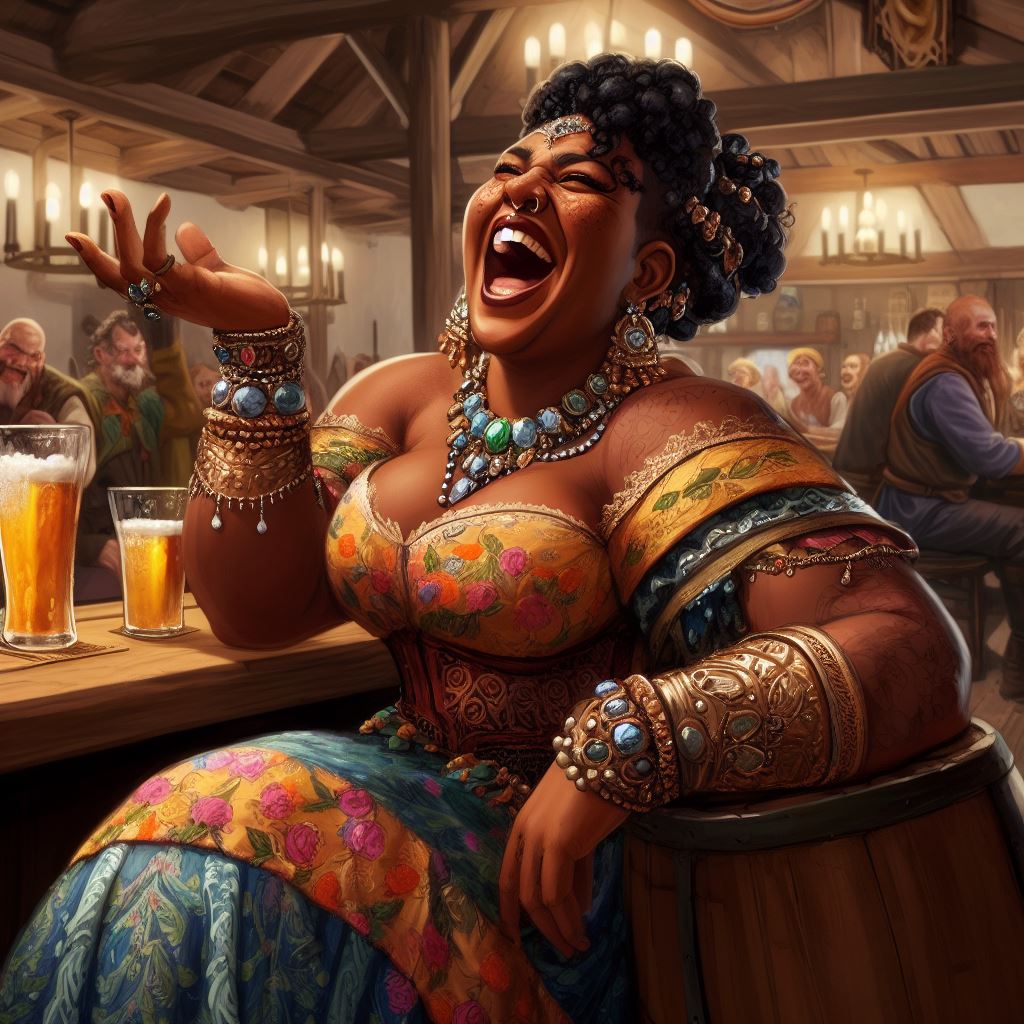 "Stella is a full figured heavy pretty female woman with curly brown hair. she is wearing chain mail armor and a flowing dress. she is smiling excitedly as she lunges forward swinging a big fist at the camera. the background is a seedy crowded rowdy medieval tavern with customers shouting and fighting. high quality fantasy painting"