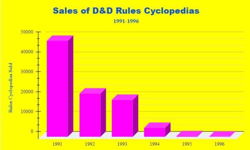 Next we’ll take a look at total BECMI sales by year, and then do a final tally of D&D vs. AD&D sales, including all D&D boxed sets and the Cyclopedia, and all monster products for AD&D.