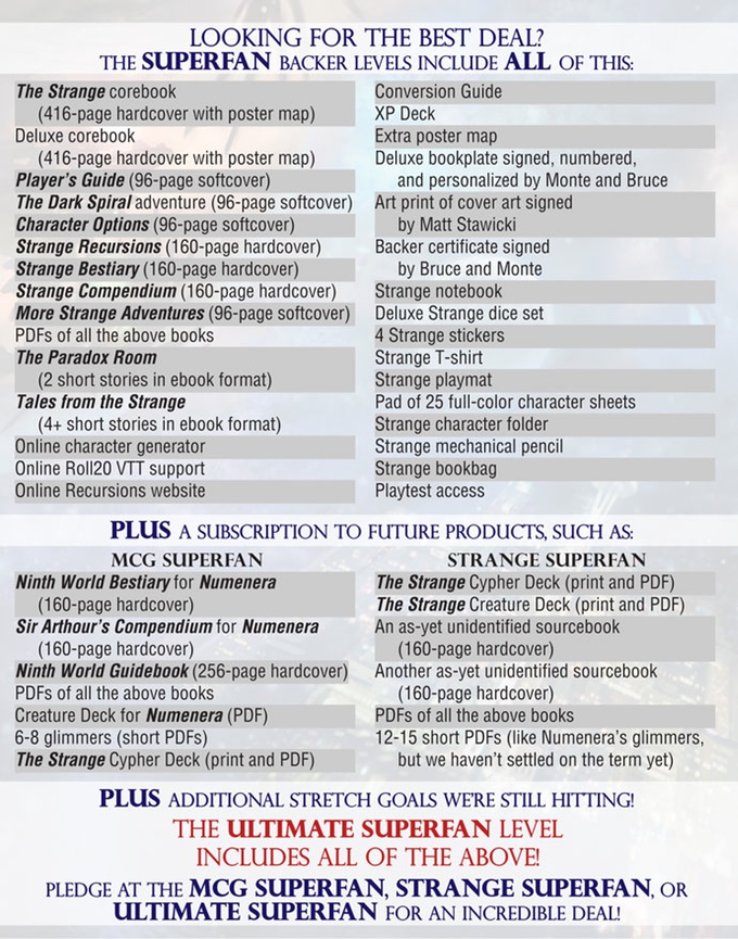 1) Thanks for being a Strange Superfan, man! You helped make all of this happen. And as of Monday Feb 29th, we delivered every single reward promised for The Strange (the glimmer/fractal Cults, Factions, and Syndicates was the last). If you haven't gotten everything, could you please contact us via the MCG Contact Us page on the MCG site?