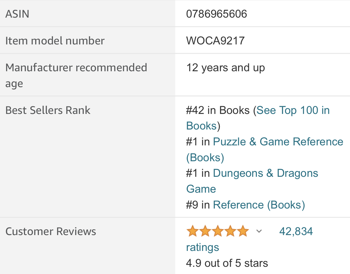 That is just so stunningly unbelievable. It's jaw dropping really. That an almost ten year old game book is selling at pretty much the same rate as it always has been. I don't think the PHB has ever dropped out of the top hundred (or just barely if it did) for almost a decade. This isn't just a best selling game book, this is getting into best selling book of all time territory. We're talking Stephen King level of sales.Players handbook is 42!